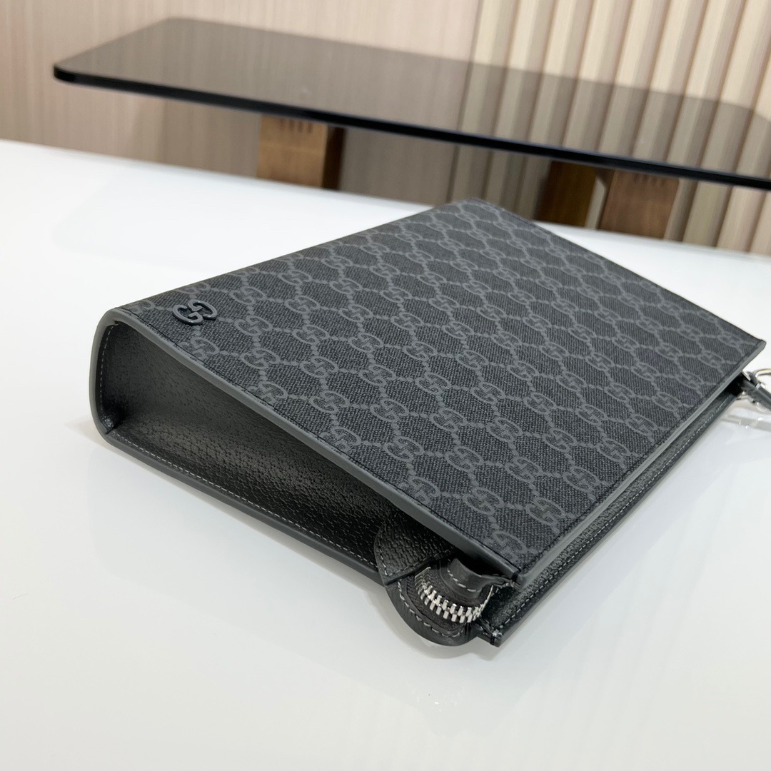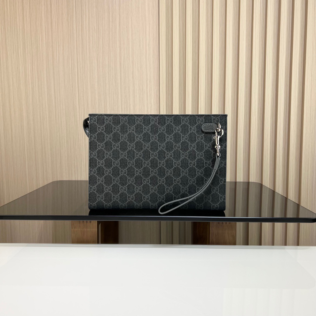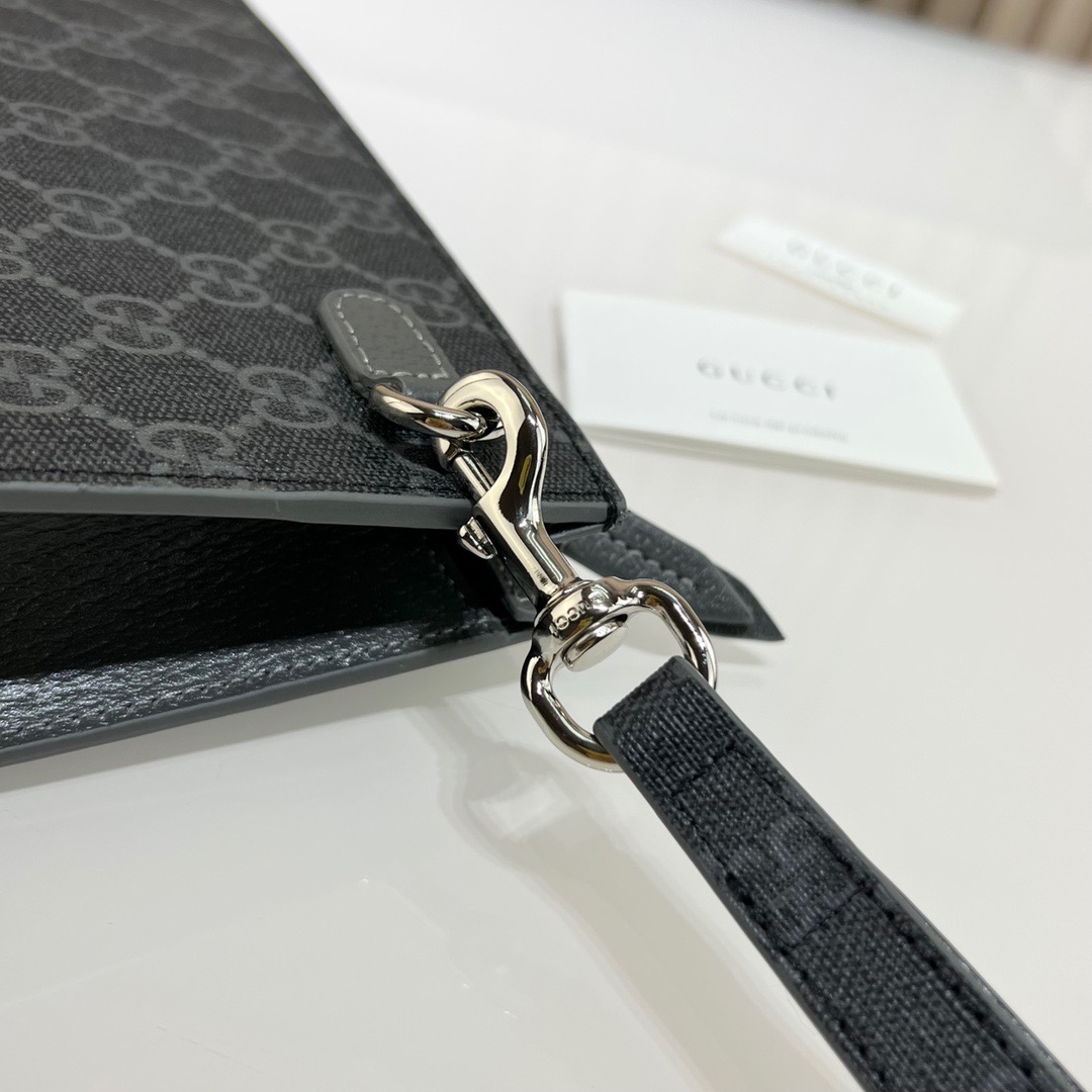 【全套包装】饰gg细节gg手拿包,款号:768255 ,釆用进口原厂皮,新推系列纤薄且小巧的小皮件焕新融蕴多种绚丽色彩,以充满对比美感的双色调设计令点缀于包身的gg标识风采尽绽。这款手拿包以黑色gg supreme帆布匠心打造,配以灰色光面皮革滚边,且设有六个卡片隔层。尺寸:18x 26x 6cm