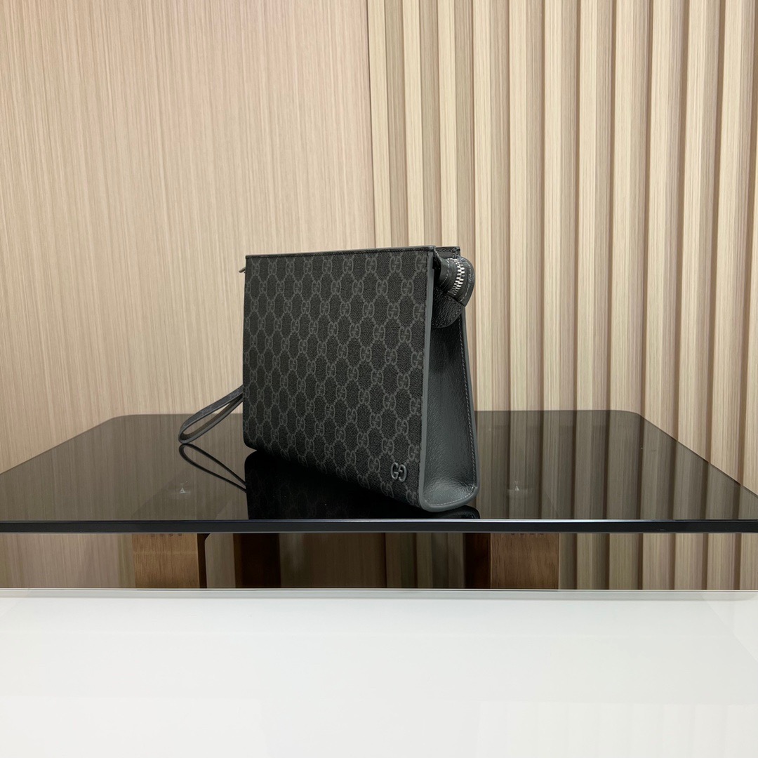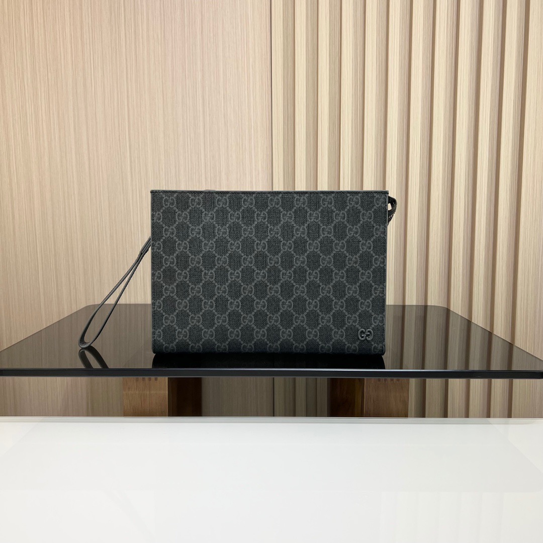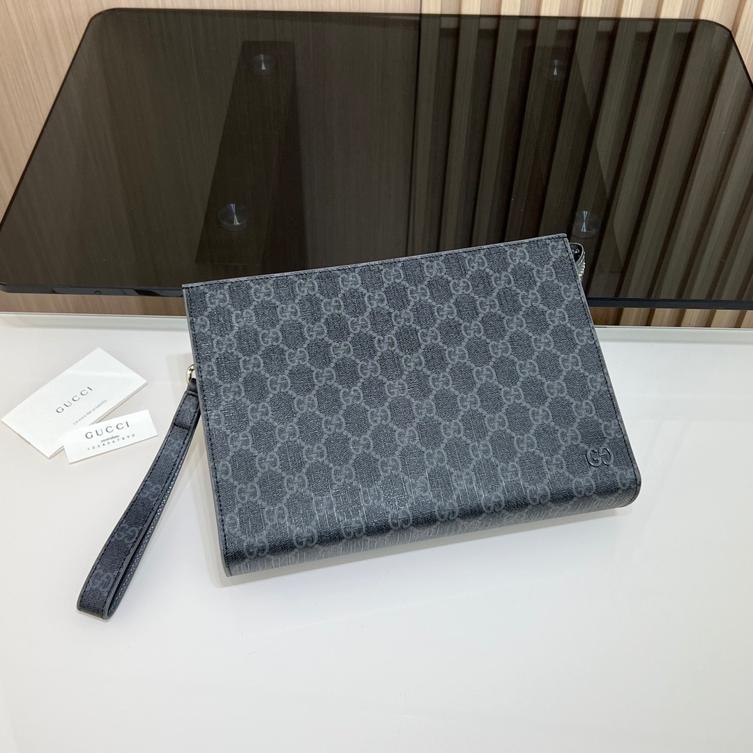 【全套包装】饰gg细节gg手拿包,款号:768255 ,釆用进口原厂皮,新推系列纤薄且小巧的小皮件焕新融蕴多种绚丽色彩,以充满对比美感的双色调设计令点缀于包身的gg标识风采尽绽。这款手拿包以黑色gg supreme帆布匠心打造,配以灰色光面皮革滚边,且设有六个卡片隔层。尺寸:18x 26x 6cm