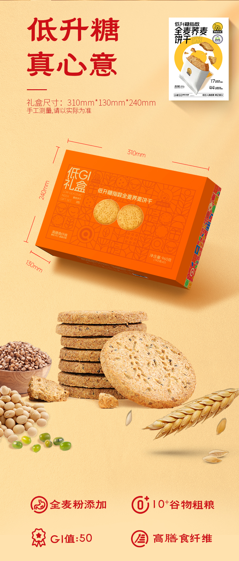 神探伍伍低GI全麦荞麦饼干礼盒960克(192g*5盒)