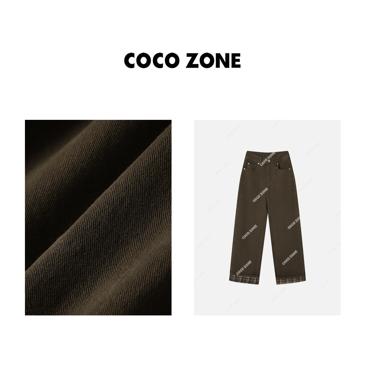 COCO ZONE 美拉德秋冬薄绒格纹翻裤脚直筒牛仔裤23C19830