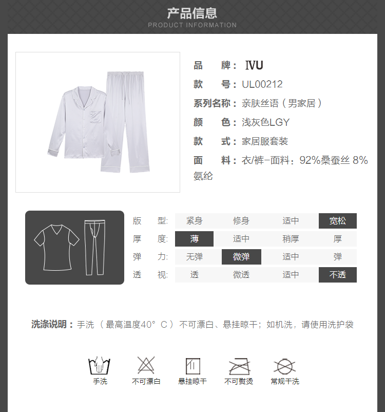 【3F】IVU桑蚕丝轻奢薄款男士家居服套装UL00212
