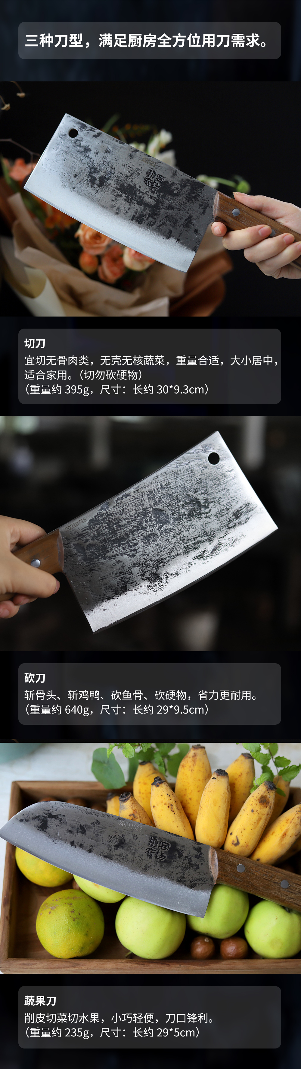 斩刀:重量约640g,尺寸:长约29*9.5cm(含刀柄)