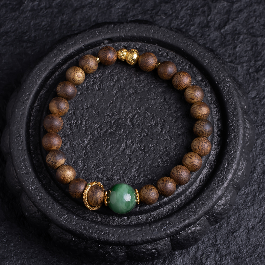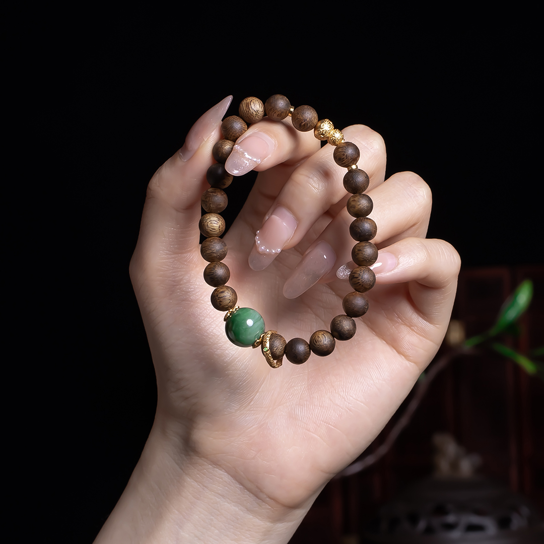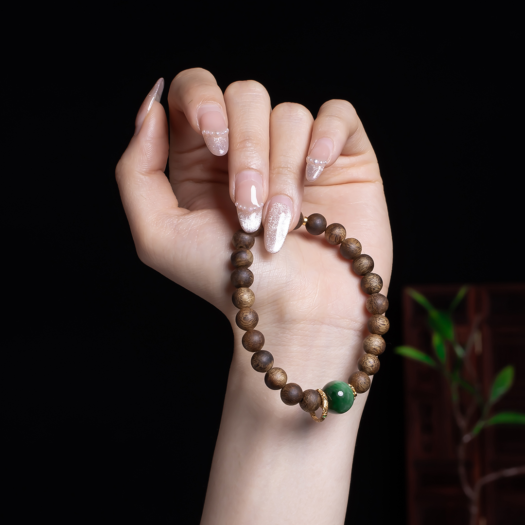XY0373沉香+碧玉猫眼渐变手串,天然沉香约7.4mm,原色原味,香味自然清甜,一颗像猫眼效应的渐变色碧玉,搭配一枚银镀金的葫芦和小跑环,让生活多一点变化,向好生活转变,心有信念,定有时来运转时。
