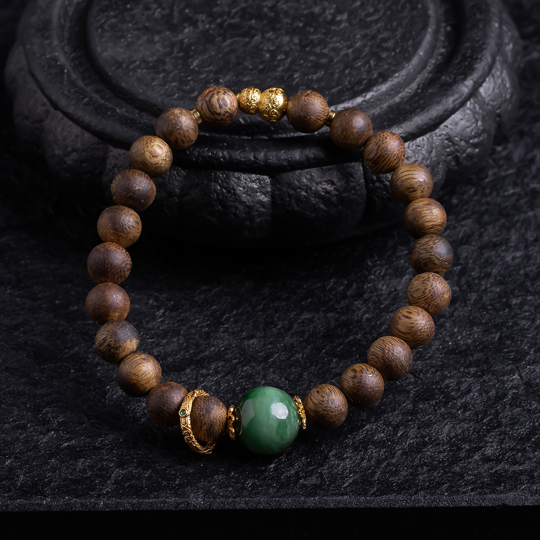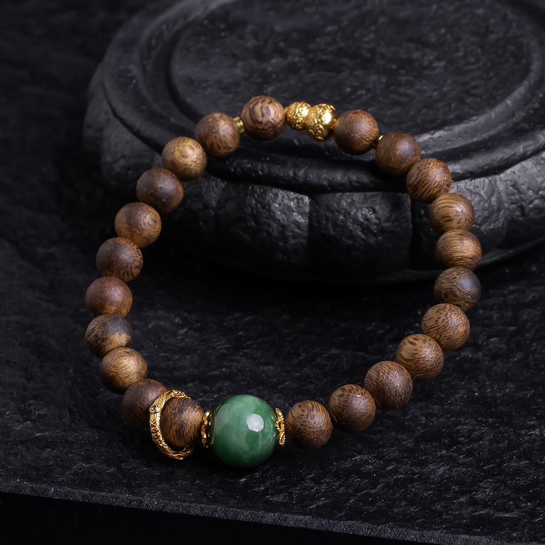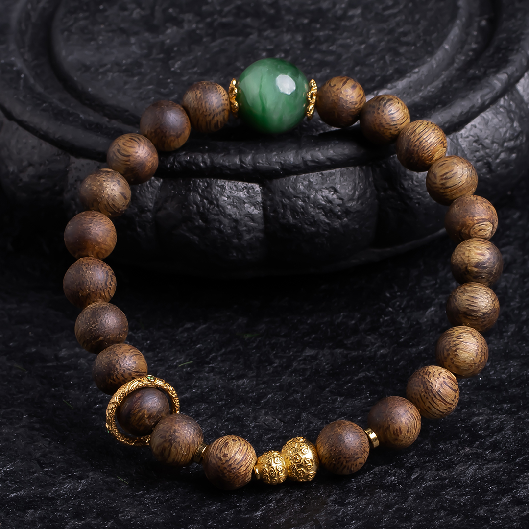 XY0373沉香+碧玉猫眼渐变手串,天然沉香约7.4mm,原色原味,香味自然清甜,一颗像猫眼效应的渐变色碧玉,搭配一枚银镀金的葫芦和小跑环,让生活多一点变化,向好生活转变,心有信念,定有时来运转时。