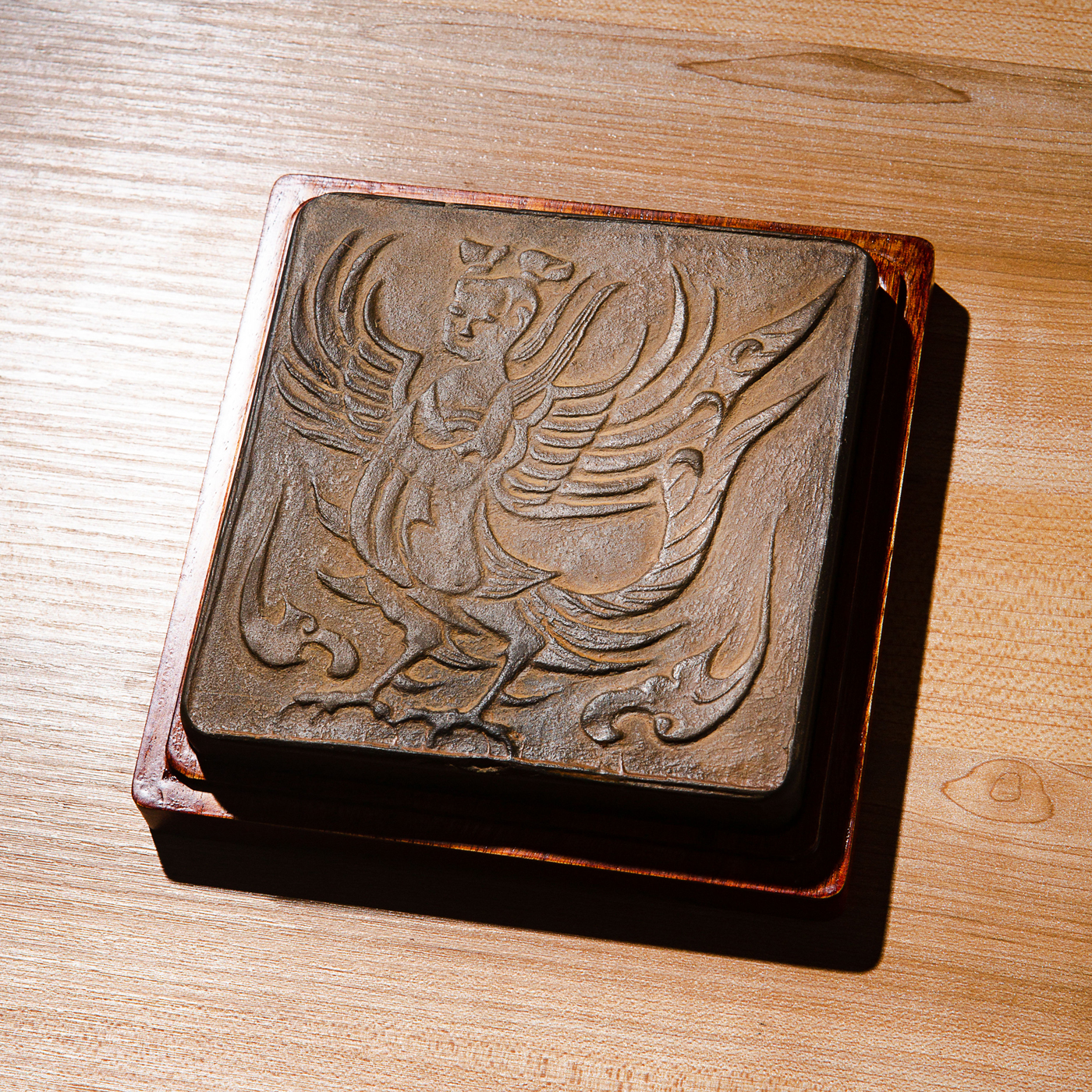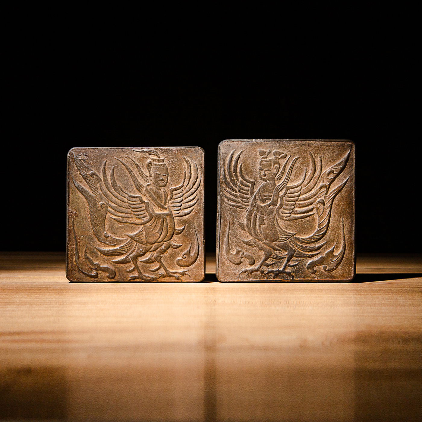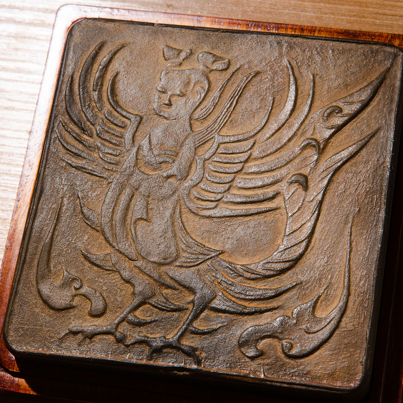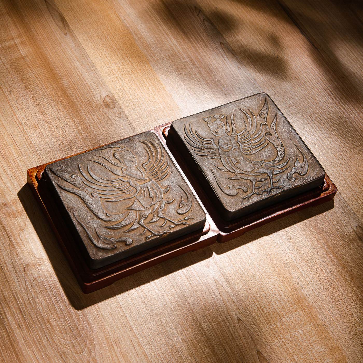 北齐古邺城“羽人”古砖制对砚,一套两方。此砖存世极稀有,品相如此之好更是难得。砖之图案精美绝伦,题材少见。砚膛采用复杂的镶嵌工艺,所镶嵌歙石质地温润细腻,石品精美。此对砚收藏价值极高,可遇而不可求。