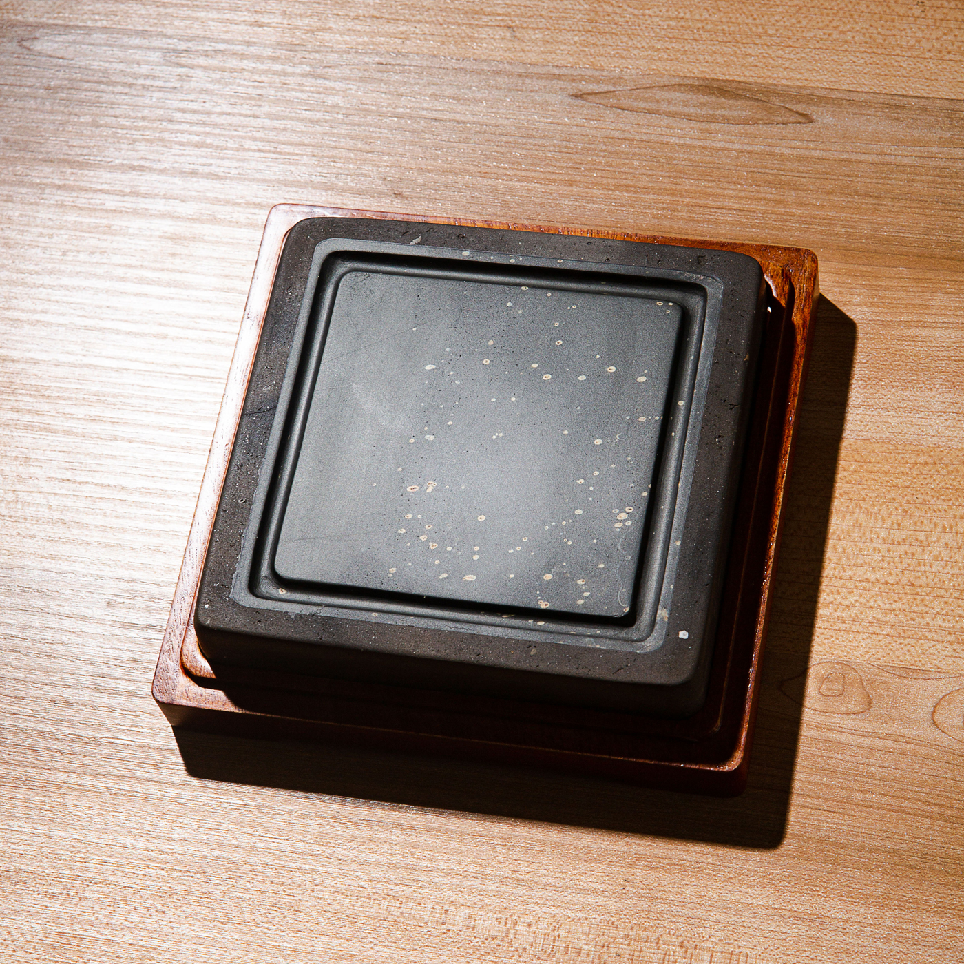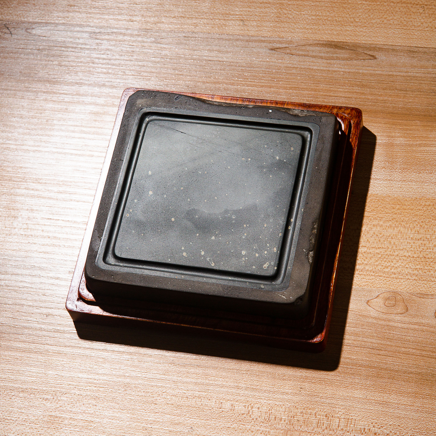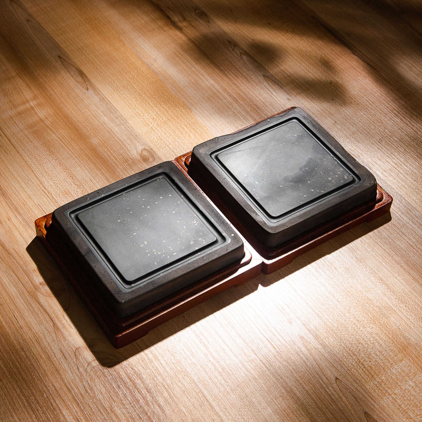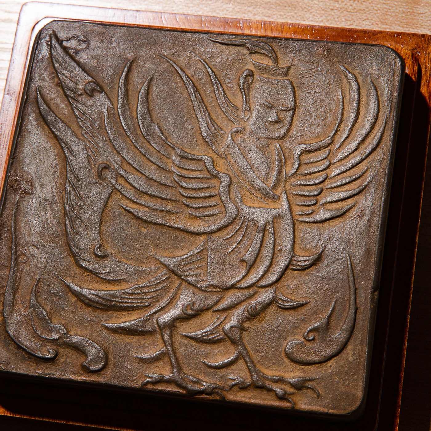 北齐古邺城“羽人”古砖制对砚,一套两方。此砖存世极稀有,品相如此之好更是难得。砖之图案精美绝伦,题材少见。砚膛采用复杂的镶嵌工艺,所镶嵌歙石质地温润细腻,石品精美。此对砚收藏价值极高,可遇而不可求。