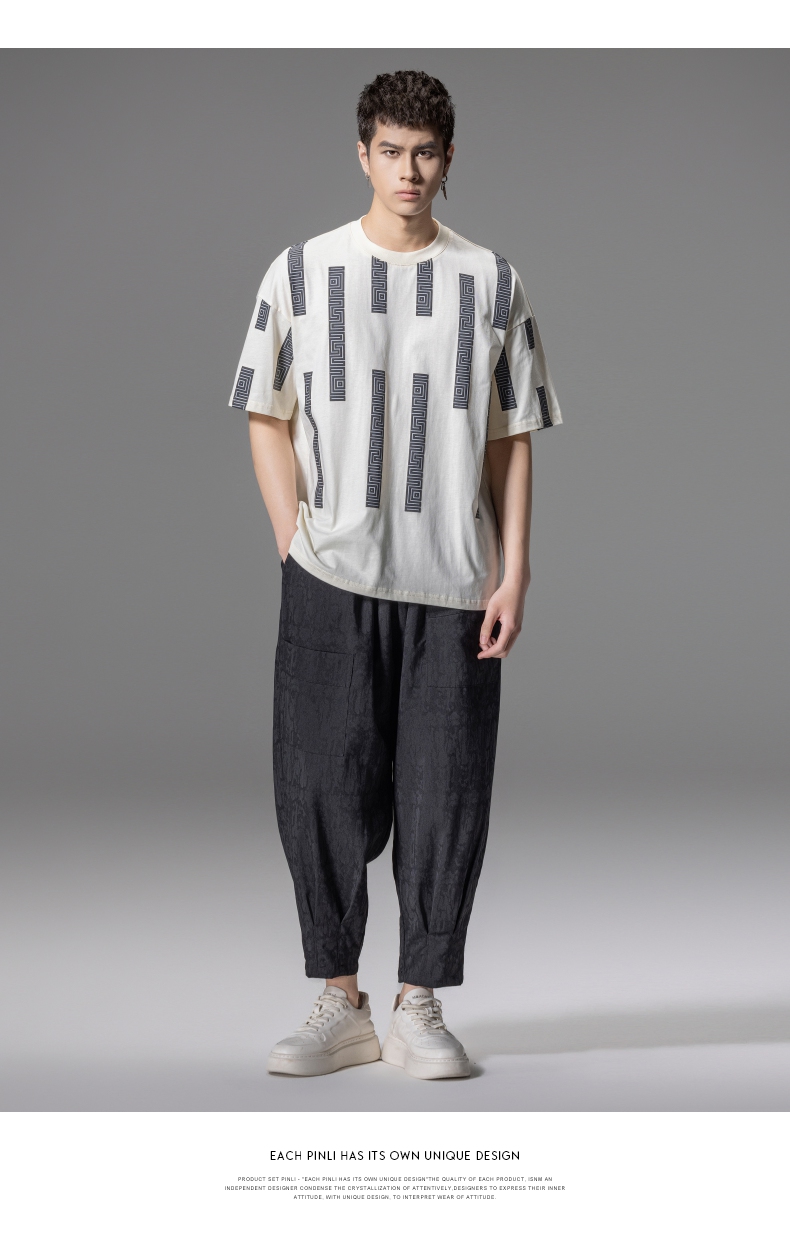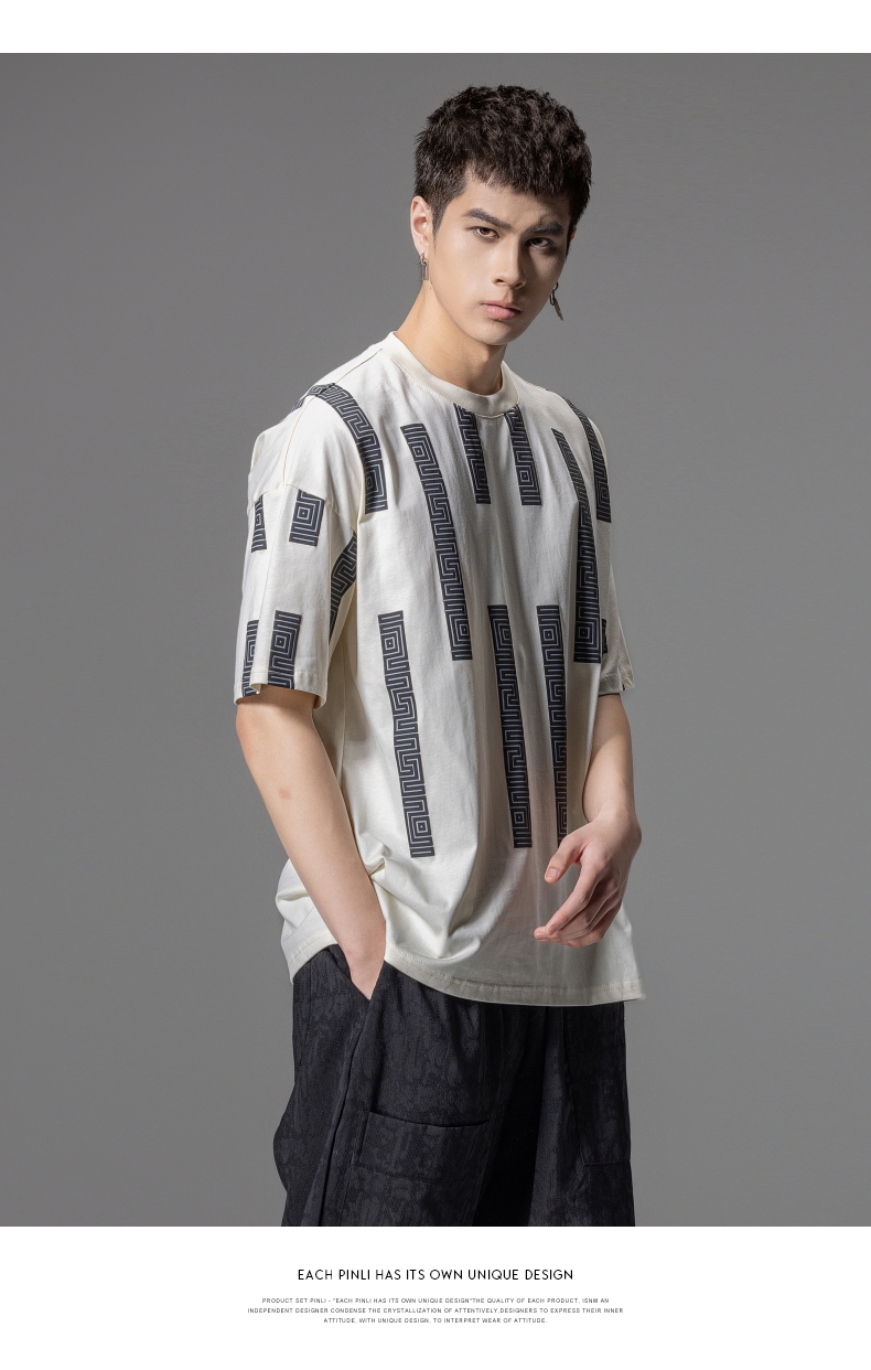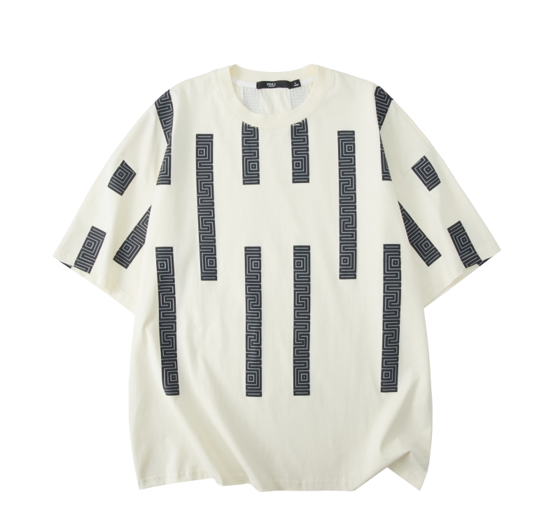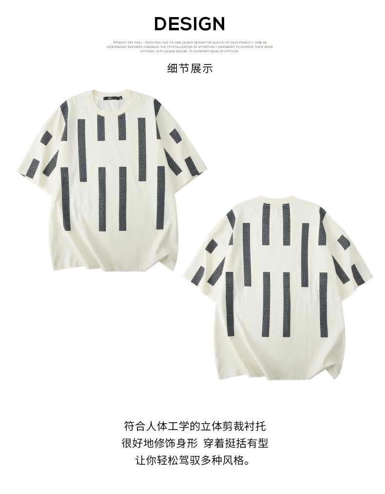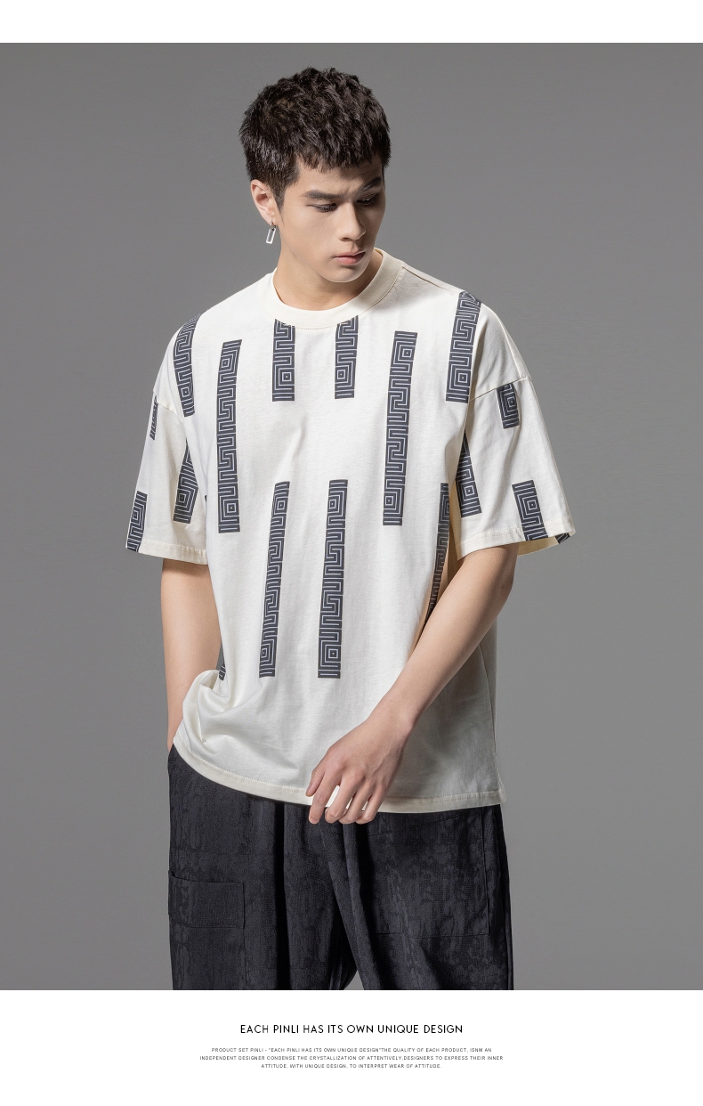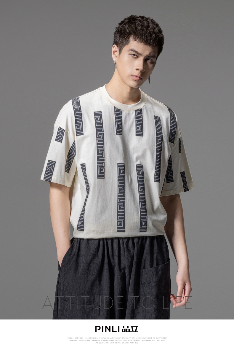 PINLI品立2024夏季新款印花杏色短袖T恤男士潮牌复古宽松休闲上衣B242111112