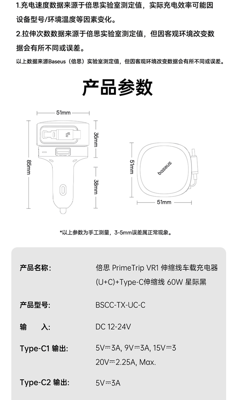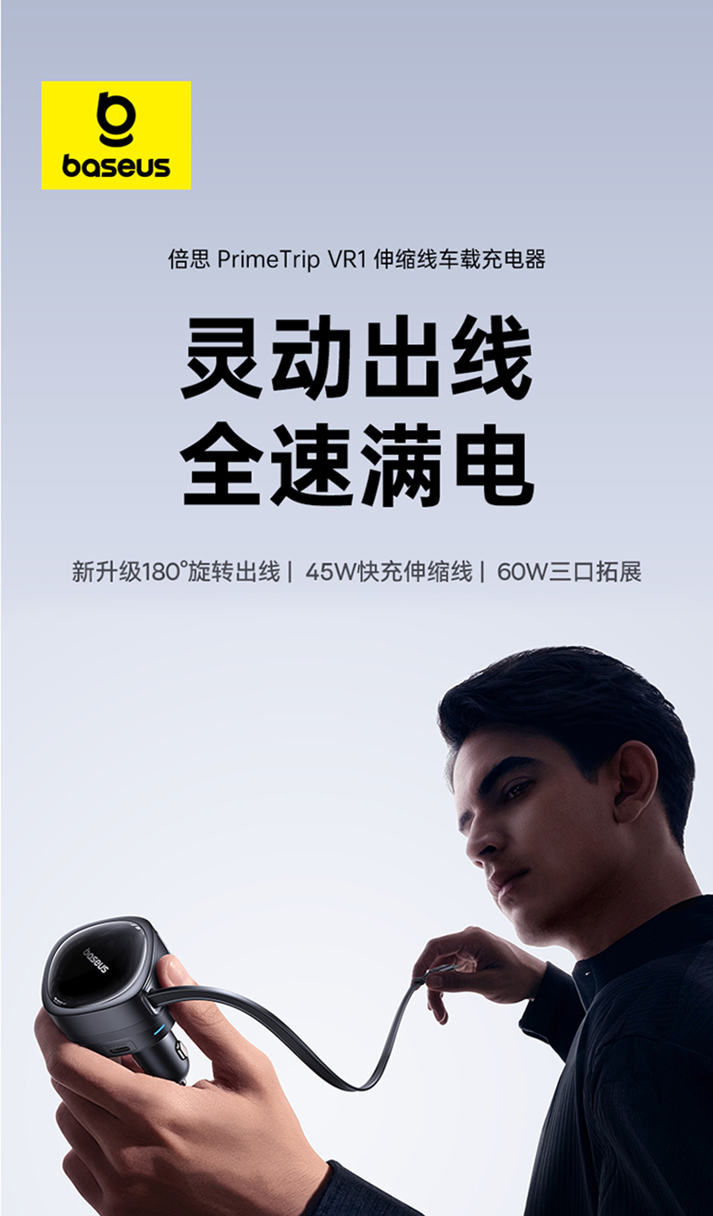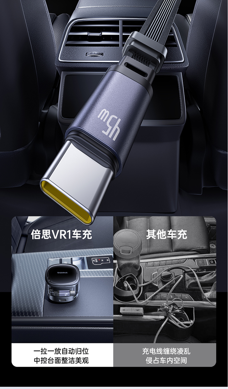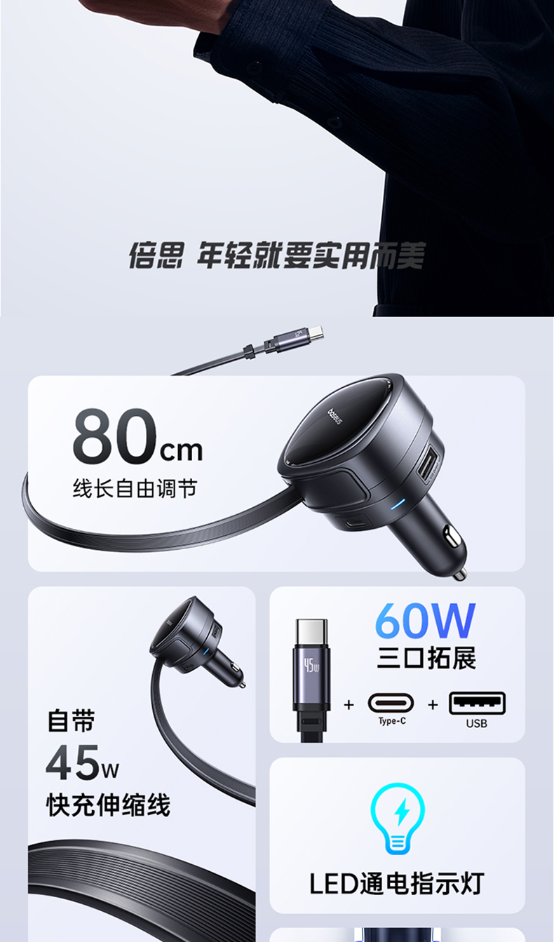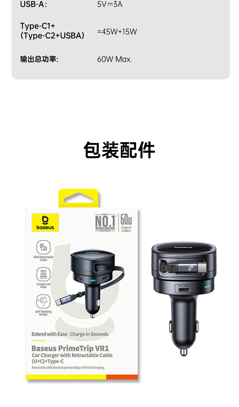 倍思 PrimeTrip VR1 伸缩线车载充电器 (U+C)+Type-C伸缩线 60W
