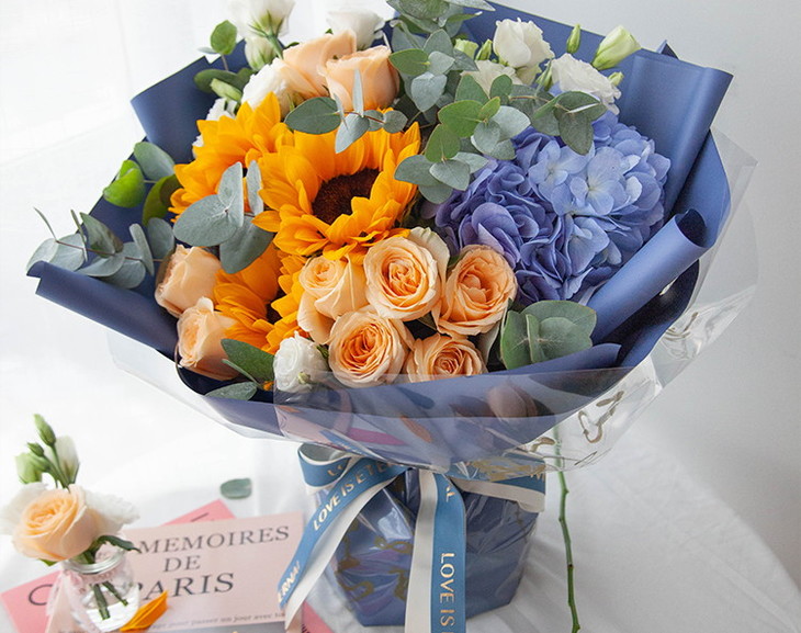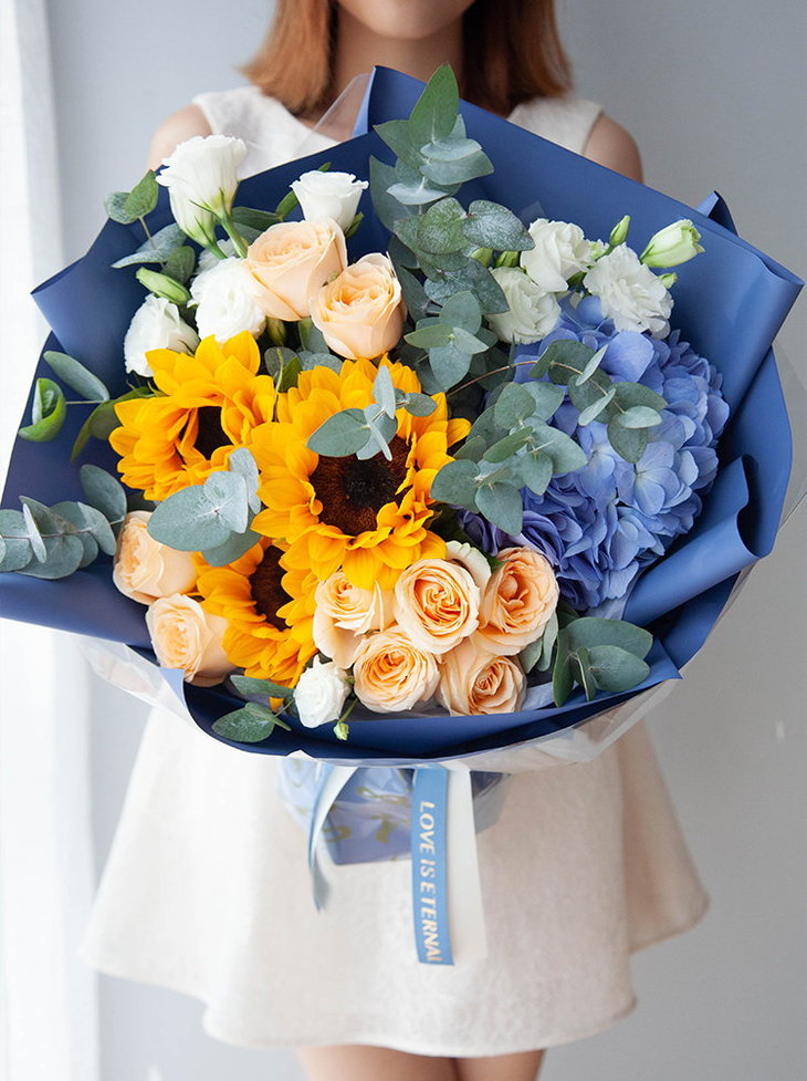 香槟玫瑰9枝、蓝绣球1枝、向日葵3枝、白色洋桔梗5枝、大叶尤加利5枝!