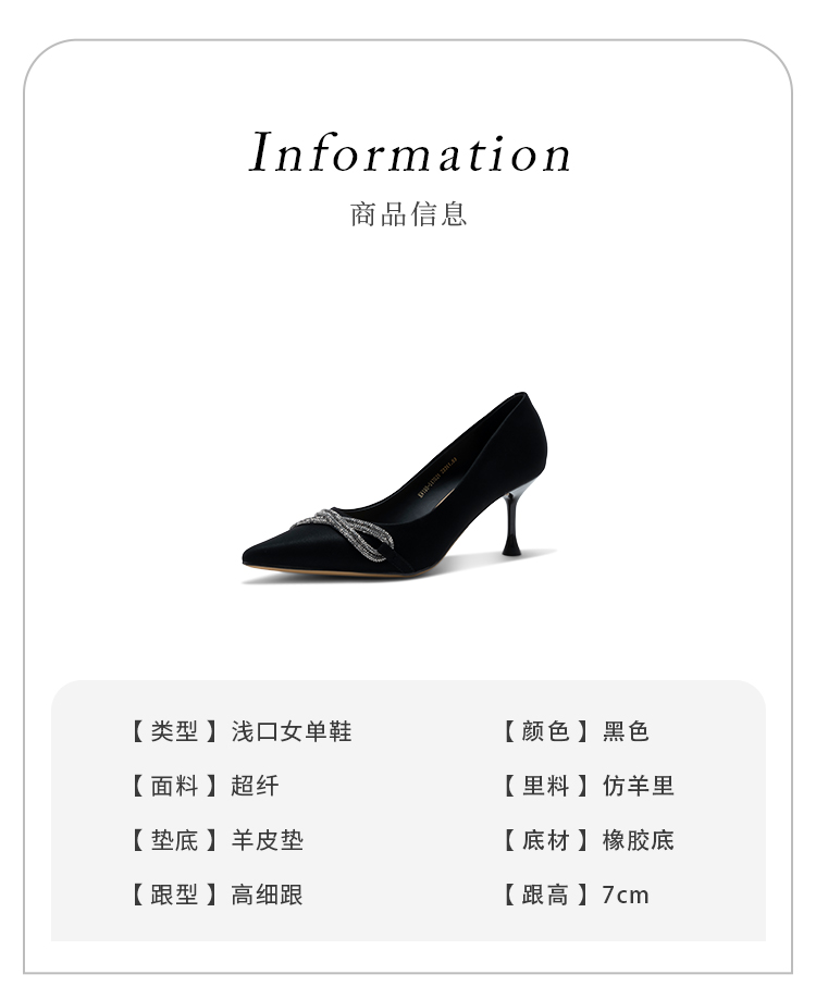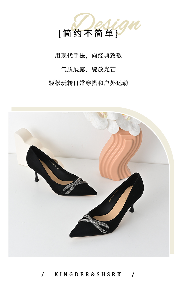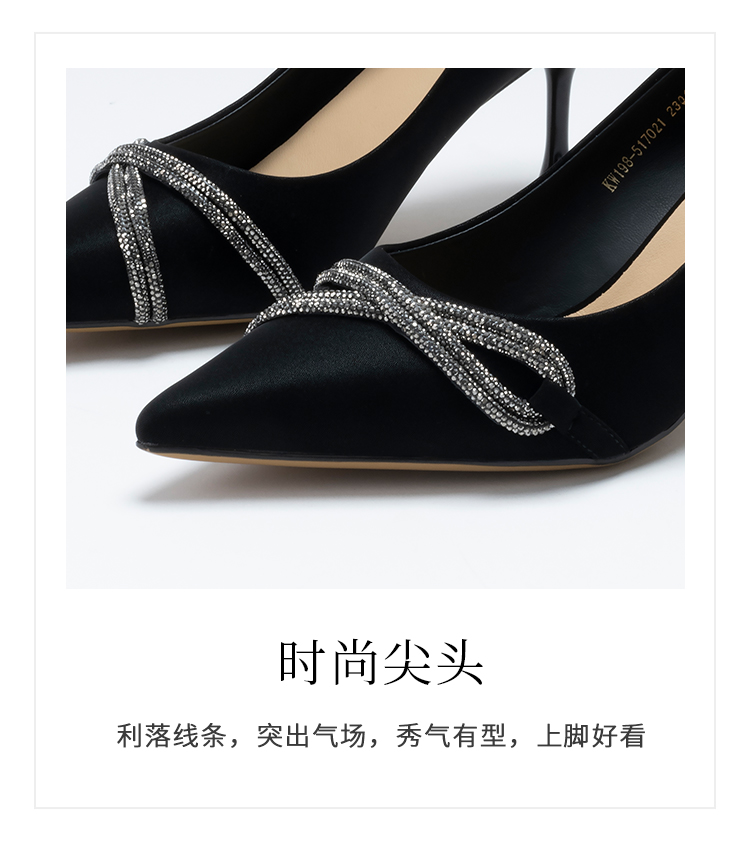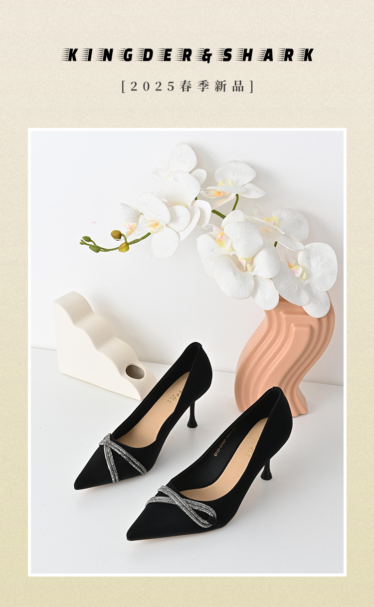 经典鲨2025年春季新品黑色优雅尖头7cm时尚水钻细高跟鞋子女KW198-517021