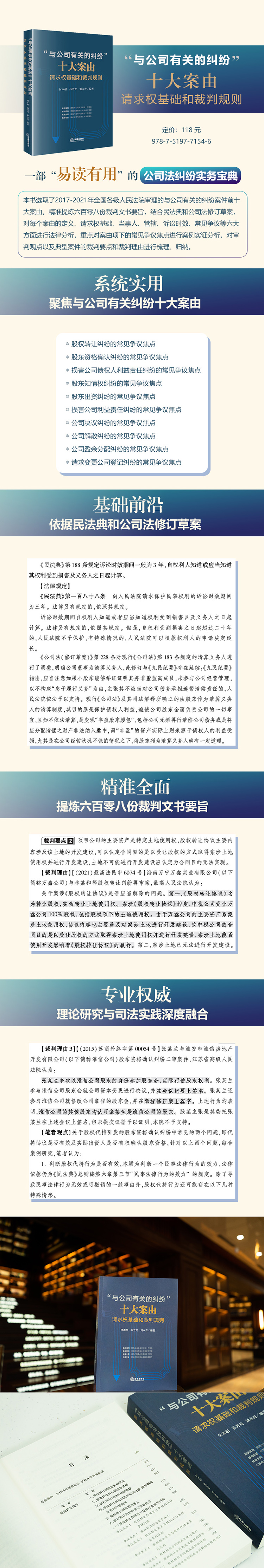 本书选取了2017—2021年全国各级人民法院审理的与公司有关的纠纷案件前十大案由,精准提炼六百零八份裁判文书要旨,结合民法典和公司法修订草案,对每个案由的定义、请求权基础、当事人、管辖、诉讼时效、常见争议焦点等六大方面进行法律分析,重点对案由项下的常见争议焦点进行案例实证分析,对审判观点以及典型案件的裁判要点和裁判理由进行梳理、归纳。