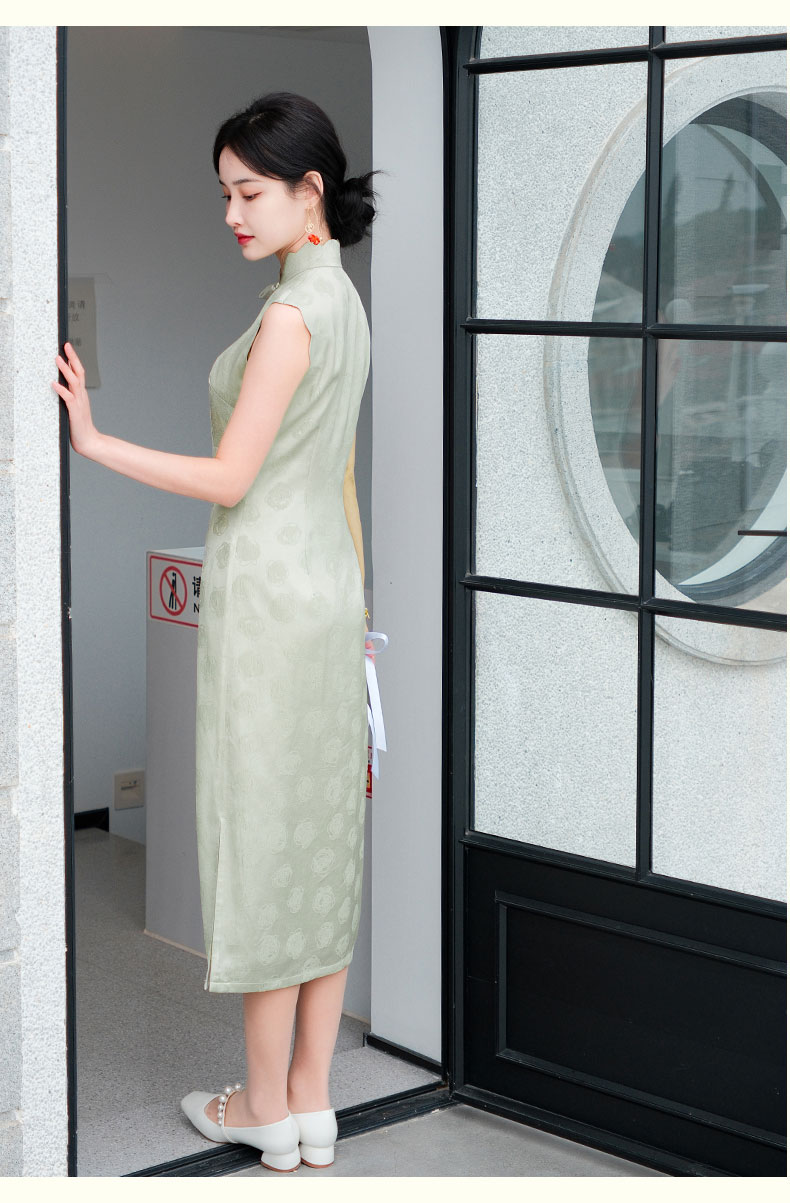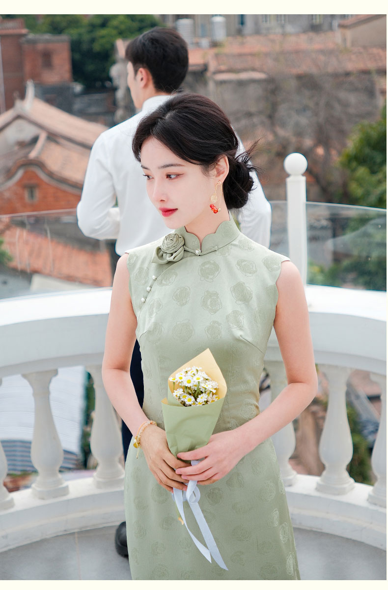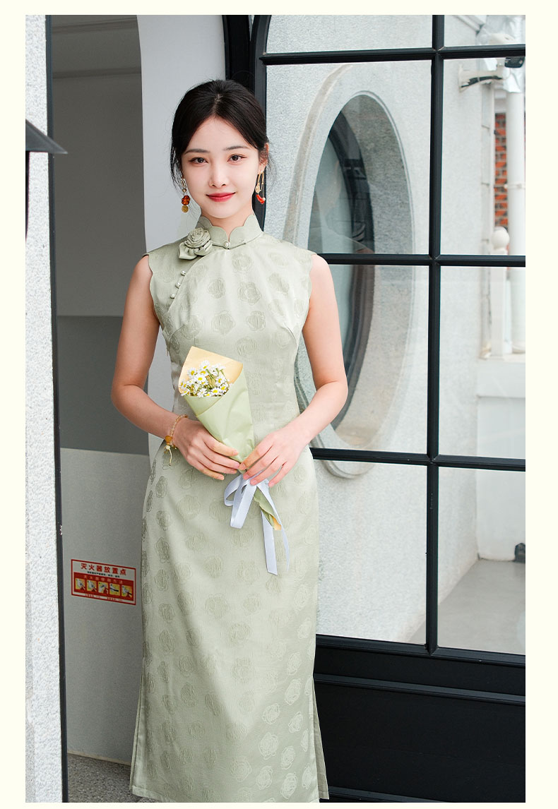 上海逸红颜青青2025夏新款提花手工花瓣领新中式文艺旗袍裙轻礼服