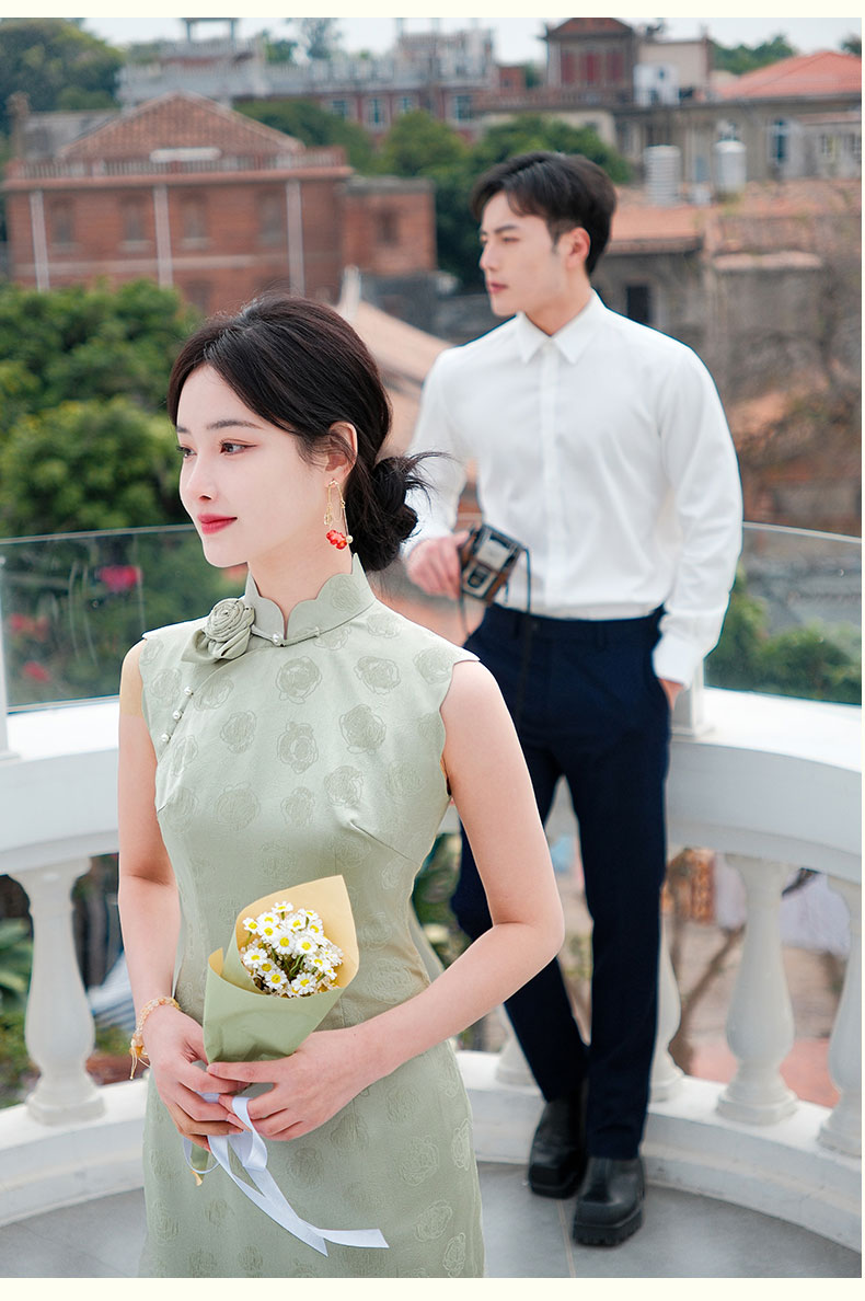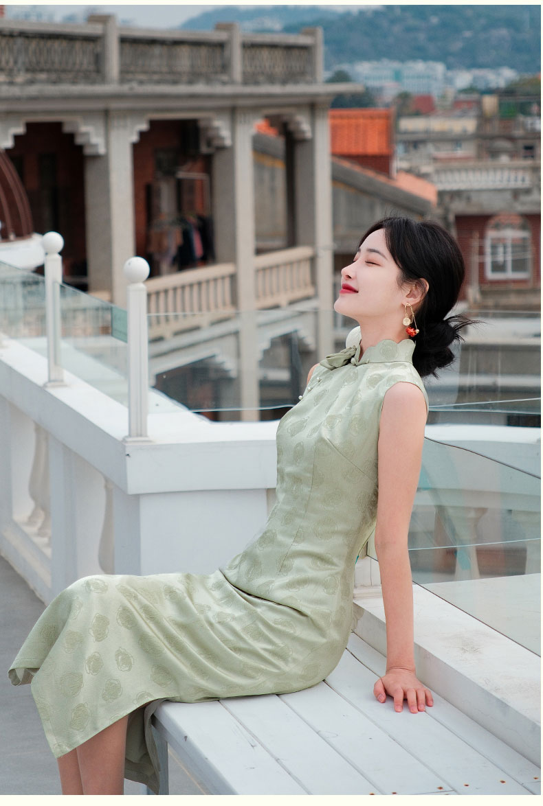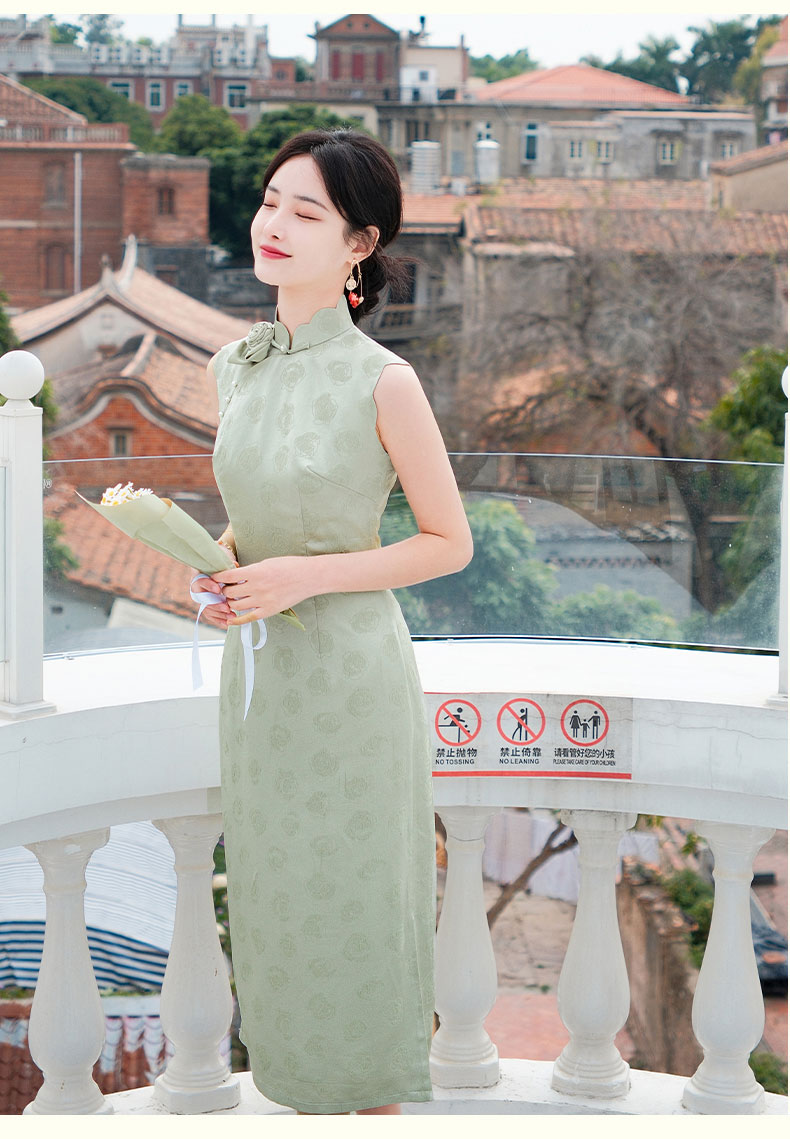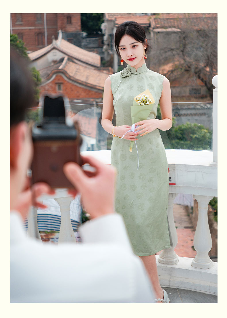 上海逸红颜青青2025夏新款提花手工花瓣领新中式文艺旗袍裙轻礼服