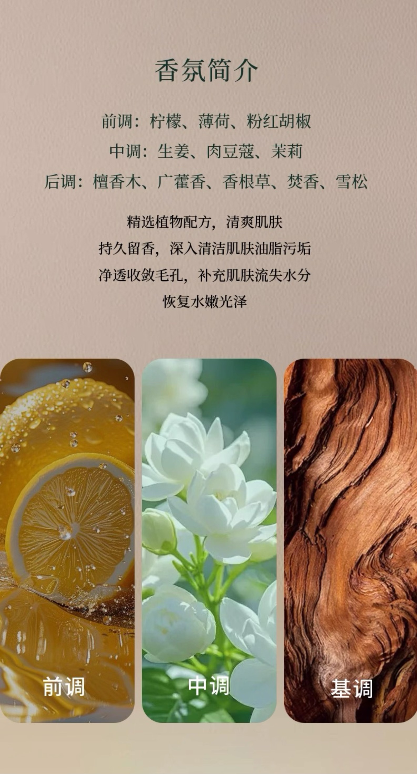 玫蕴经典·花香冰洋:前调是柠檬、薄荷与粉红胡椒的清新碰撞,瞬间唤醒沉睡的感官;中调生姜、肉豆蔻与茉莉交织缠绕,暖意悄然蔓延;后调檀香木、广藿香与香根草的醇厚收尾,沉稳绵长。
