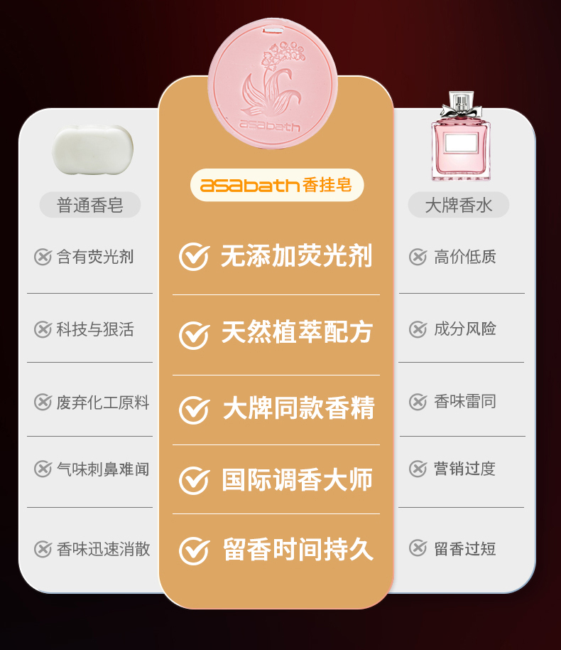 除了精油皂,asabath的香挂也好用,同样是天然植萃配方,香气清而不淡、雅而不浓,毫无刺鼻感,却能悄然勾勒出舒适惬意的生活氛围。更搭载180天持久留香科技,轻松祛除异味,让香气自然浸润每一处空间。挂在衣柜,衣物会染上淡淡的自然花香;置于车内,清香环绕能舒缓驾驶压力,出行也能香香的!