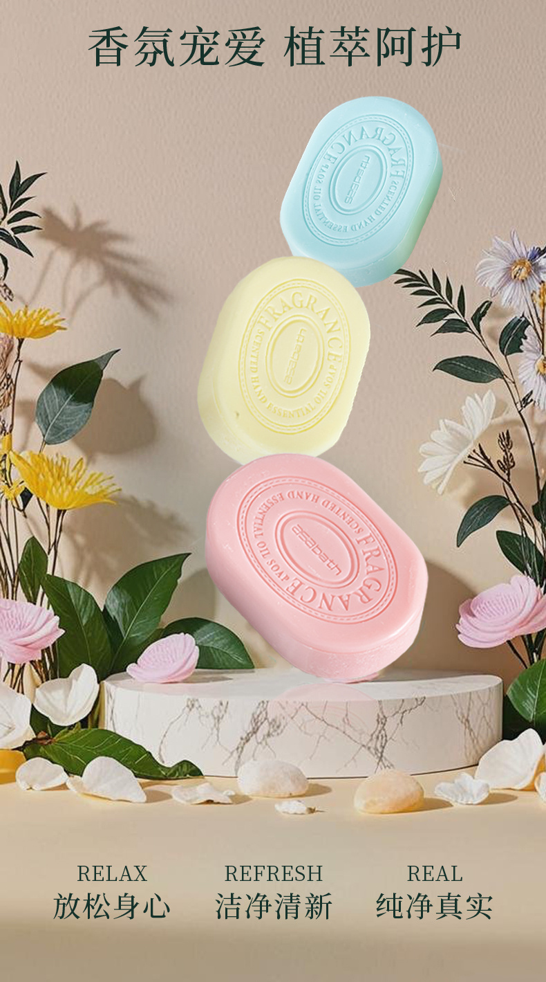 asabath精油皂系列,不仅打破了普通香皂清洁即干燥的痛点,更坚决摒弃荧光剂、矿物油、激素等有害添加,秉持8大0添加安心配方——0皂基、0酒精、0矿物油、0激素、0荧光剂、0刺激表活、0重金属、0尼泊金酯类防腐剂,即便是敏感肌,也能安心享受清洁的乐趣。