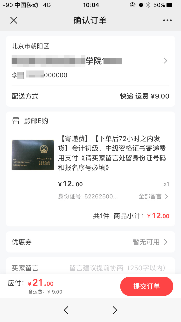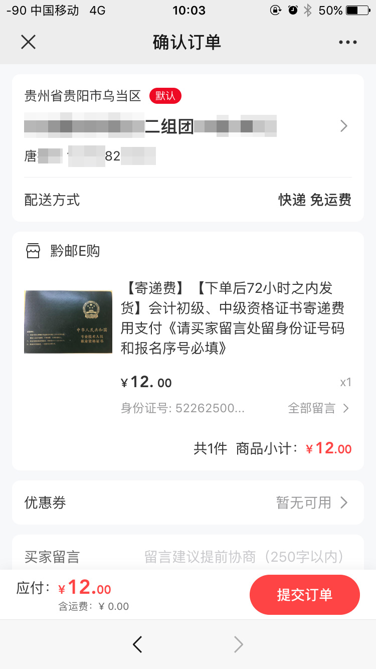 7.若下单后订单被关闭,则是贵阳会计大厦无法取到您的证书,请认真核对收件人姓名,身份证,证书管理号是否为真实信息,任意一项信息不一致都可能导致快递小哥取不到证书。