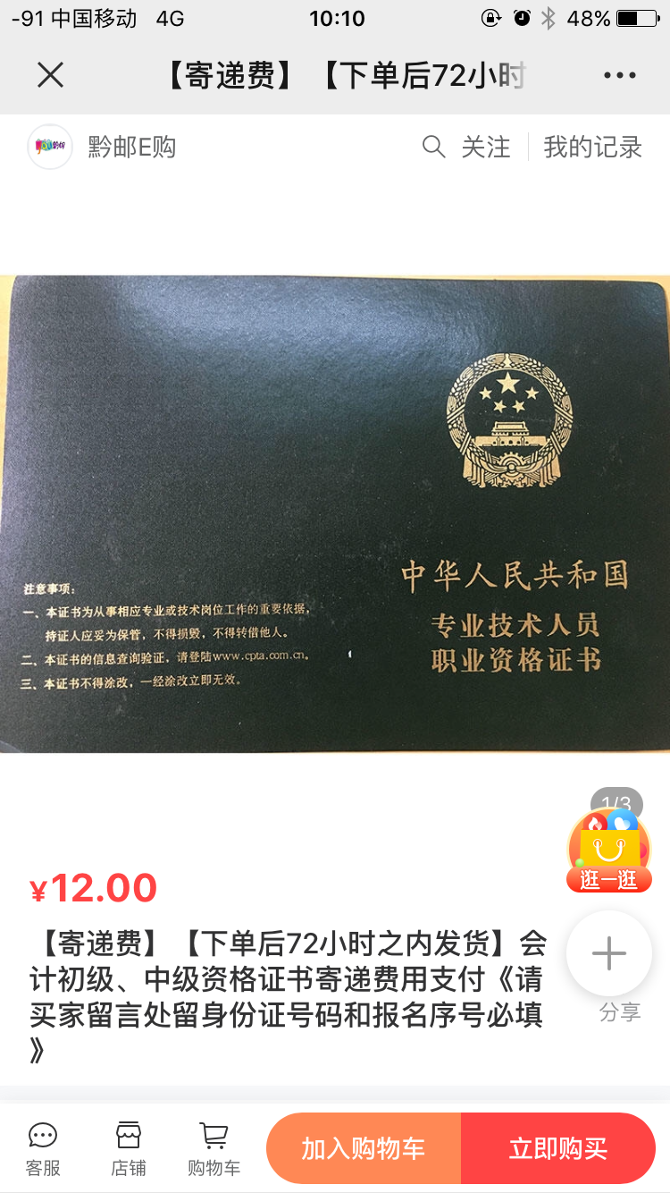 【寄递费】【下单后72小时之内发货】会计初级、中级资格证书寄递费用支付《请买家留言处留身份证号码和证书管理号必填》