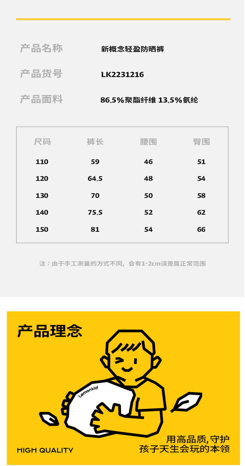 柠檬宝宝儿童防晒裤小孩户外轻盈防紫外线裤子女高弹运动长裤