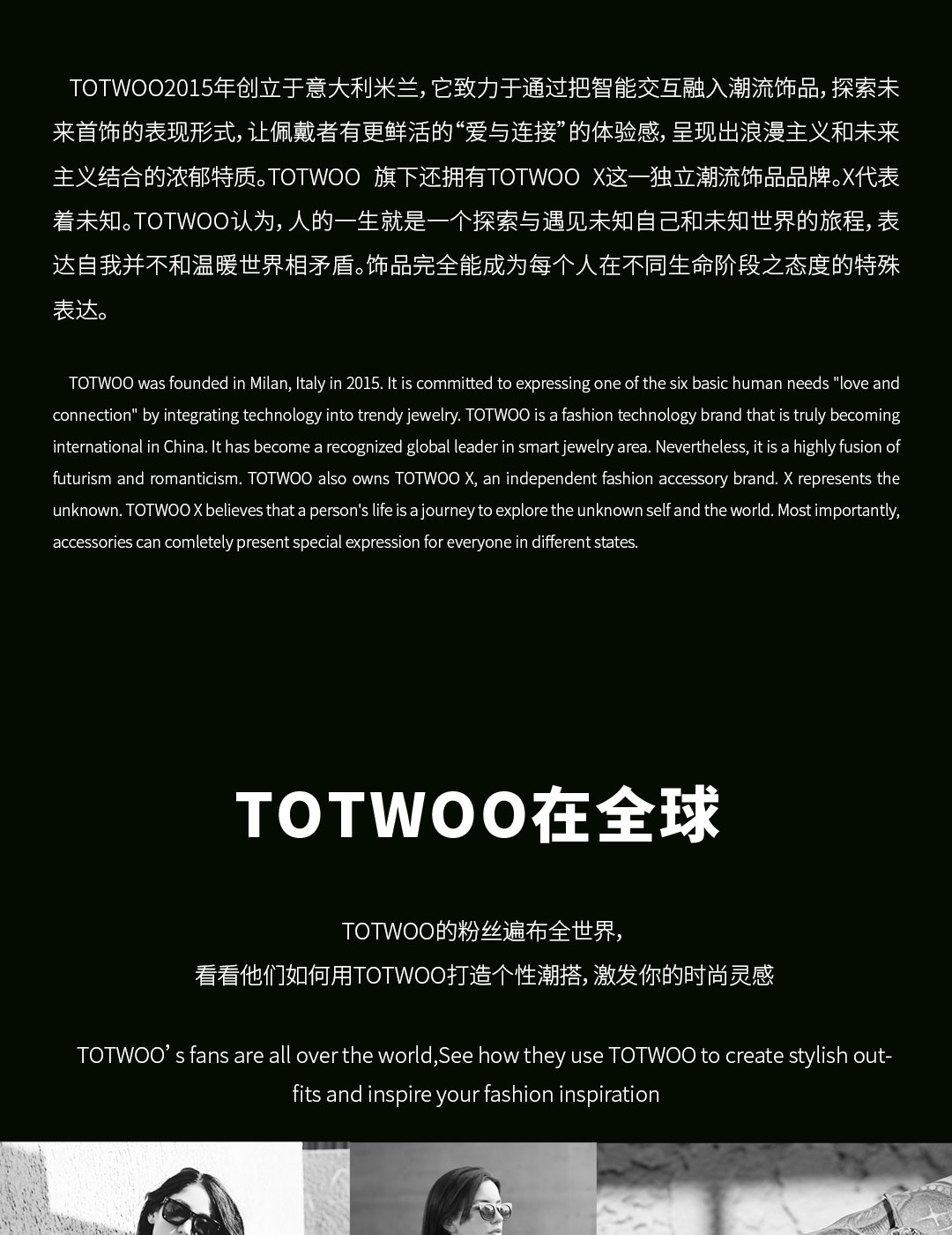 - TOTWOO-代表未来的智能珠宝,诞生于意大利米兰,是世界上首个融社交、科技和时尚于一体的智能珠宝。