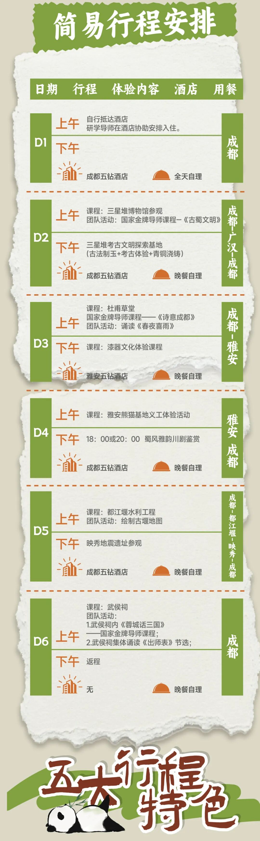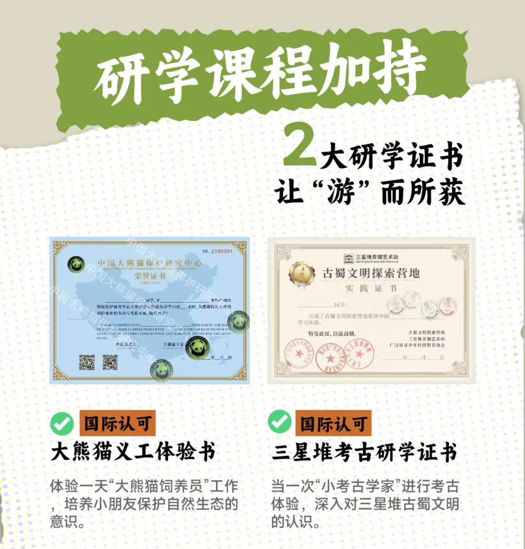 熊猫义工证书,三星堆考古研学证书,《研学手册》设计与制作费用、课程与活动材料费(儿童比成人多出部分,由儿童门票差价部分补足,不做另外收费),耳麦+矿泉水。