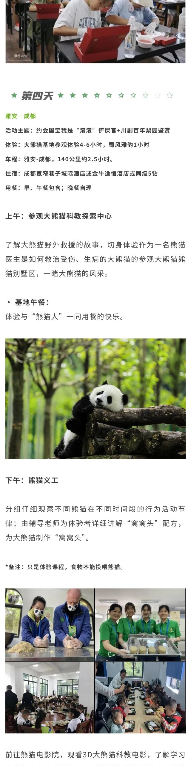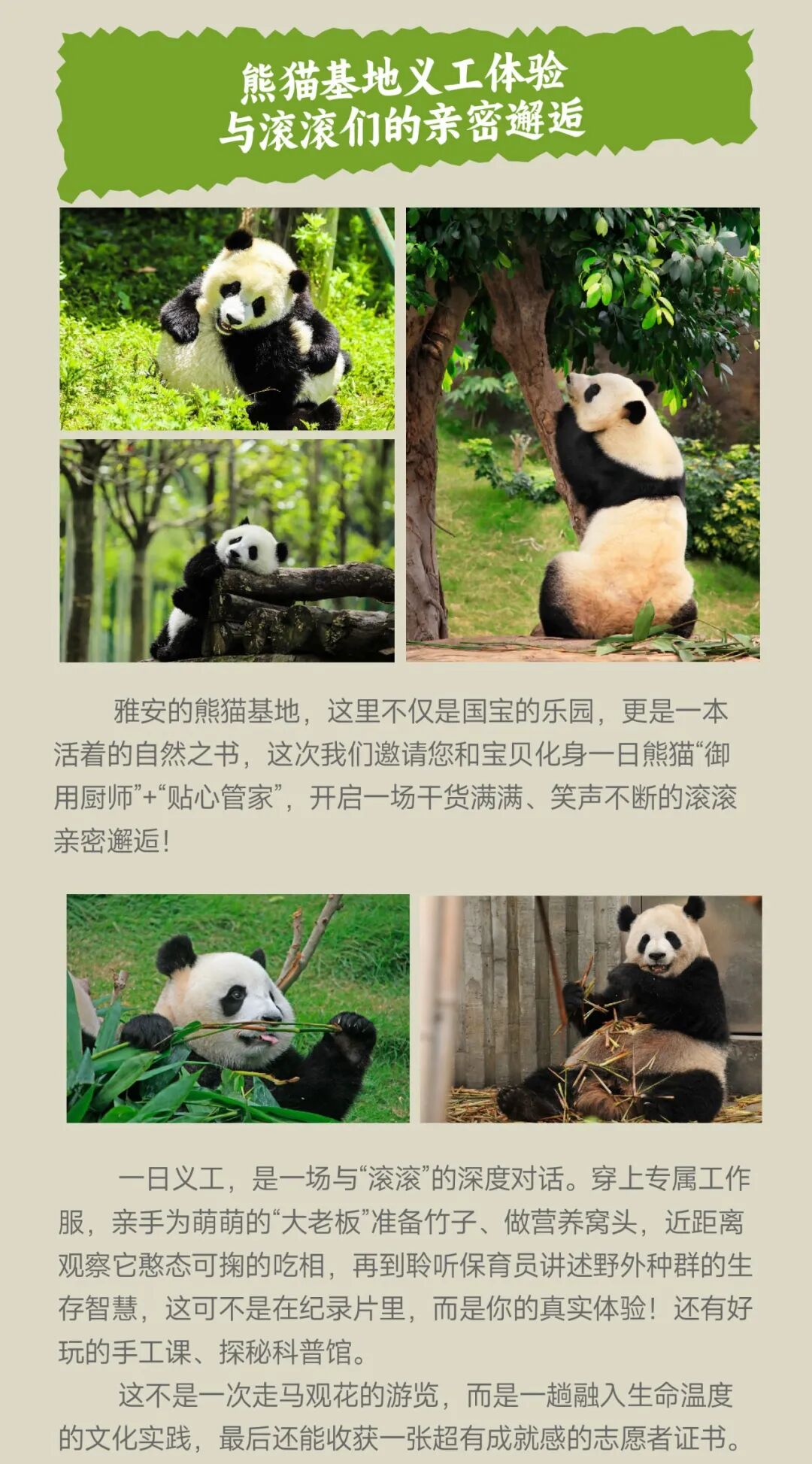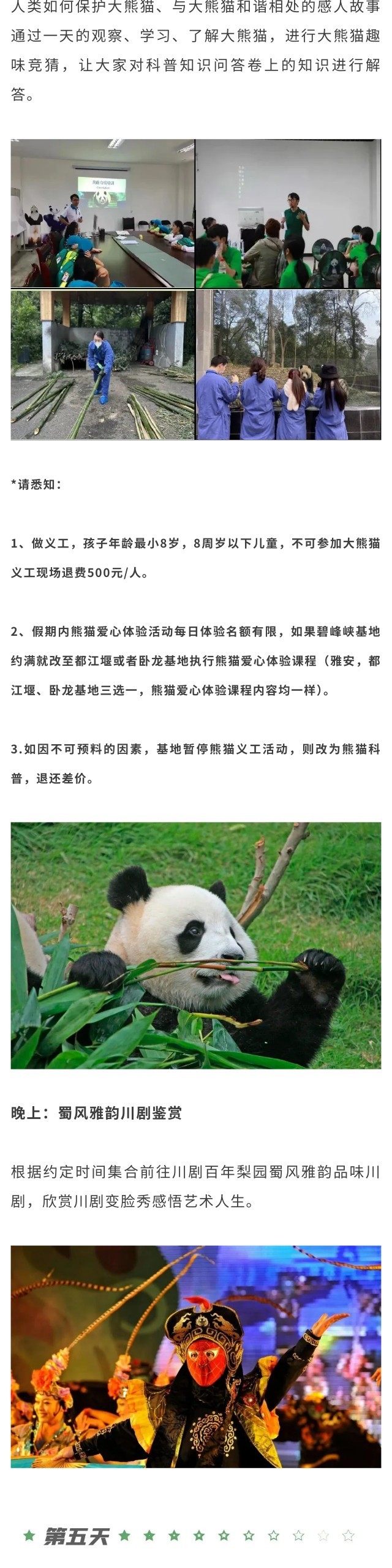 *熊猫义工活动为雅安、都江堰、卧龙基地三选一,课程内容均一样,以实际预约为准;大熊猫基地义工体验活动,儿童需8周岁以上才可参加;如有传染性疾病不可报名,不可隐瞒,请提前告知。8周岁以下儿童,不可参加大熊猫义工,现场退费500元/人。