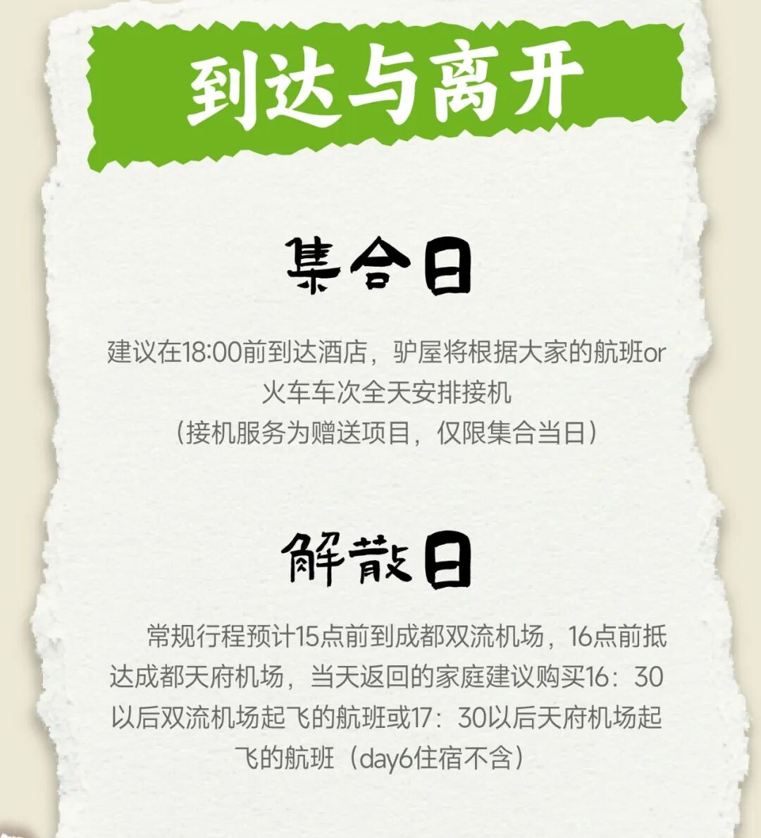 接送机:集合日一个家庭安排一次接机,解散日统一送机一次;如为火车返程,需自行前往高铁车站。