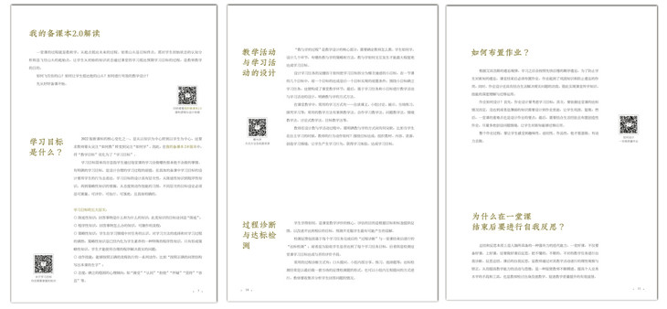 在备课本中,有一个新增的设计——教学系统各环节的专业解读和知识拓展。这一设计能够帮助教师系统思考教学设计,清晰了解设计框架背后那些看不见的逻辑。教师在备课时先阅读这些提示内容,能够明显提升备课效能。