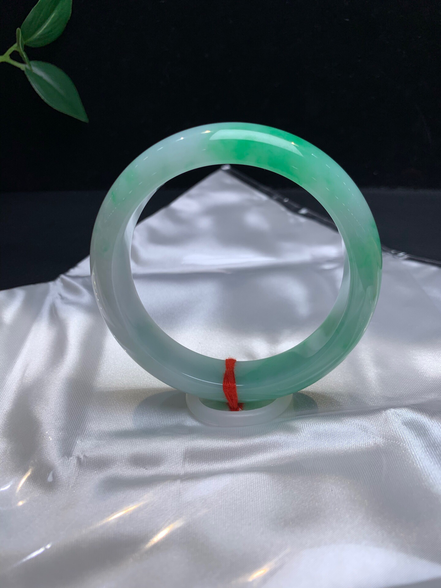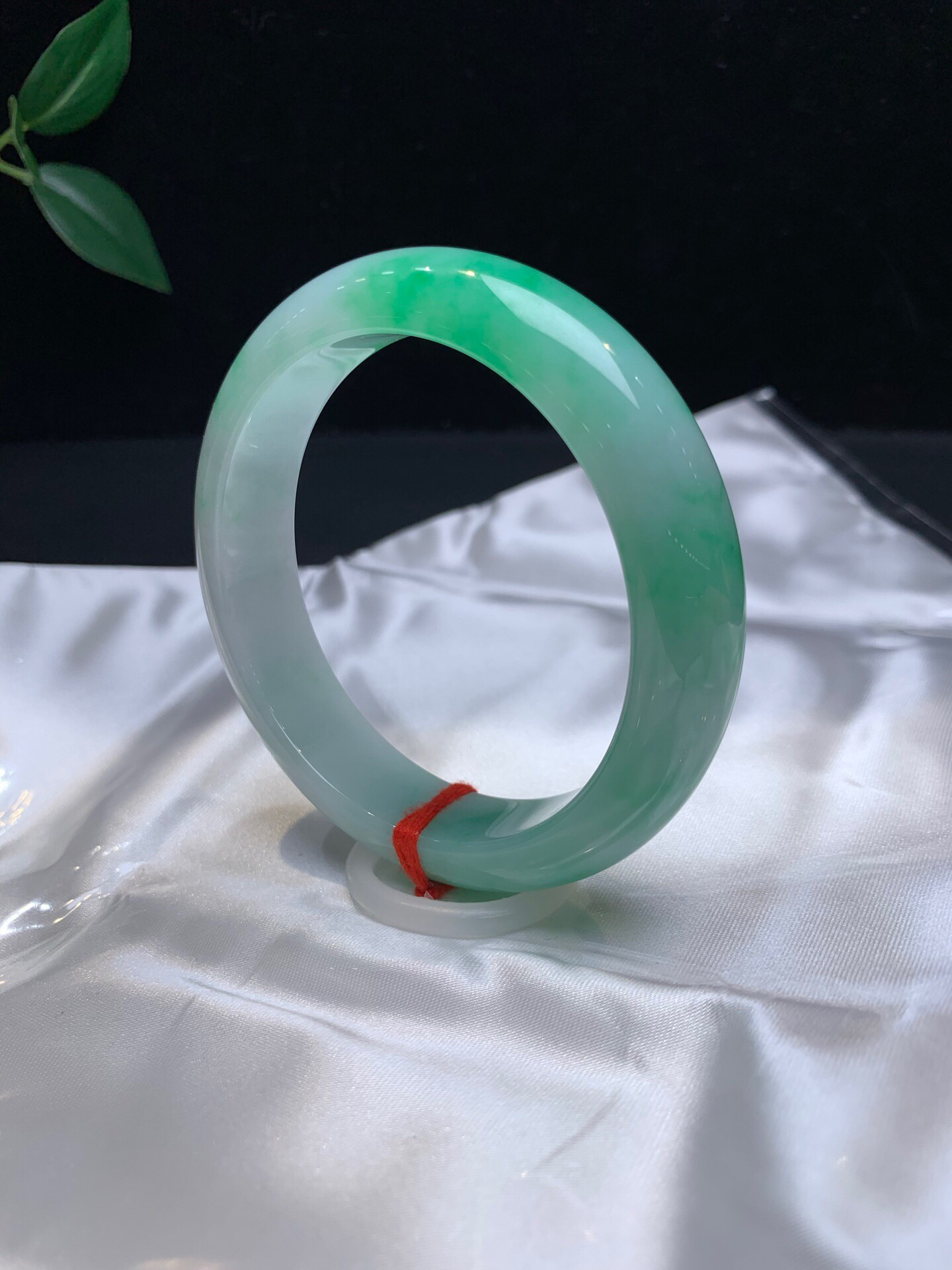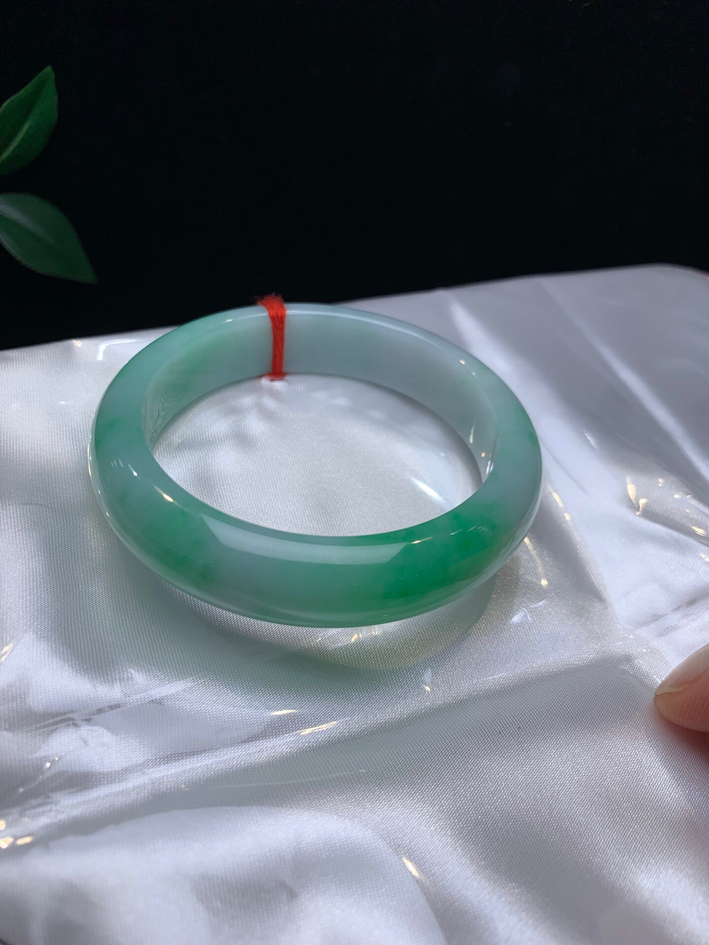 612560,56.3阳绿底手镯,版型好,大半圈带绿,整体均匀细腻,有一处特色洒金