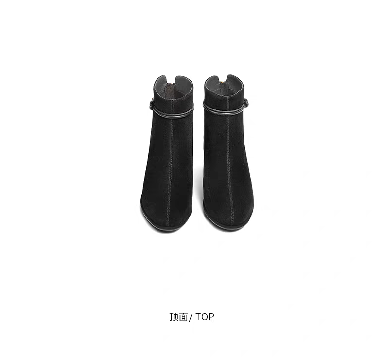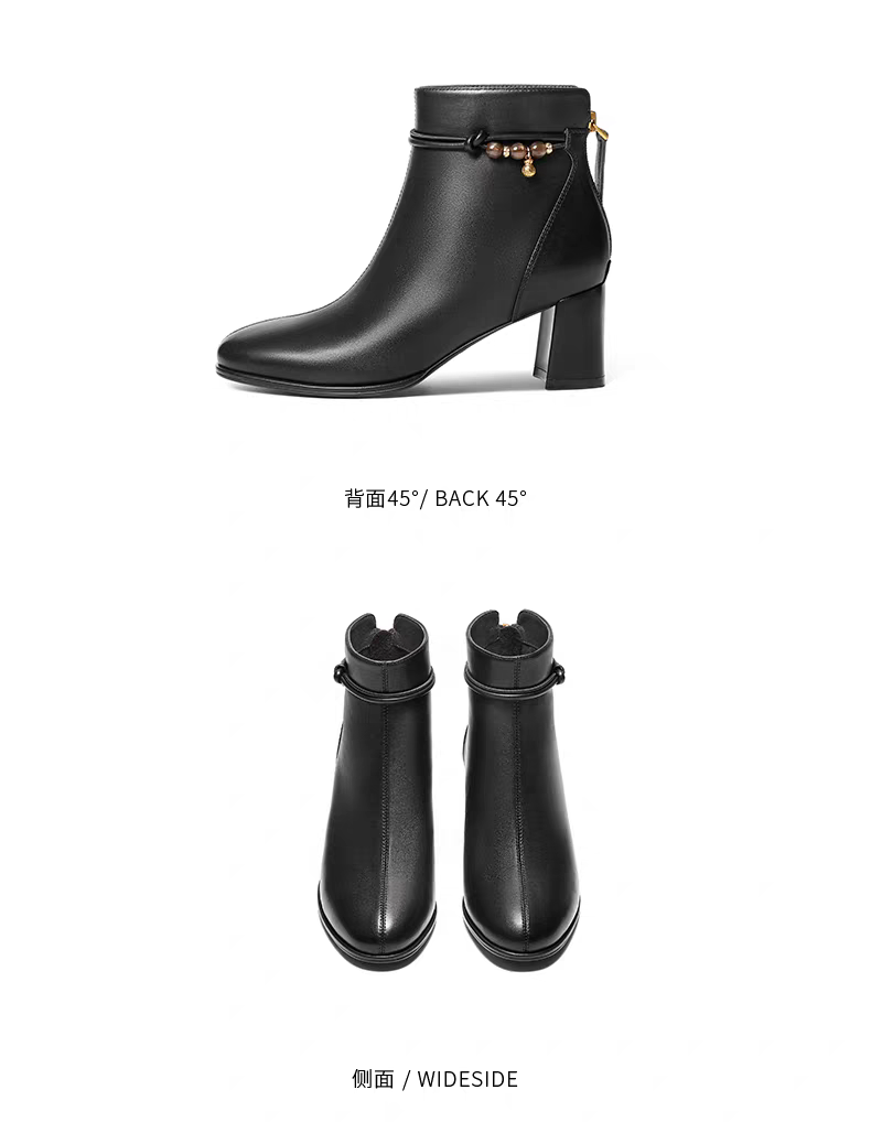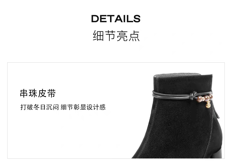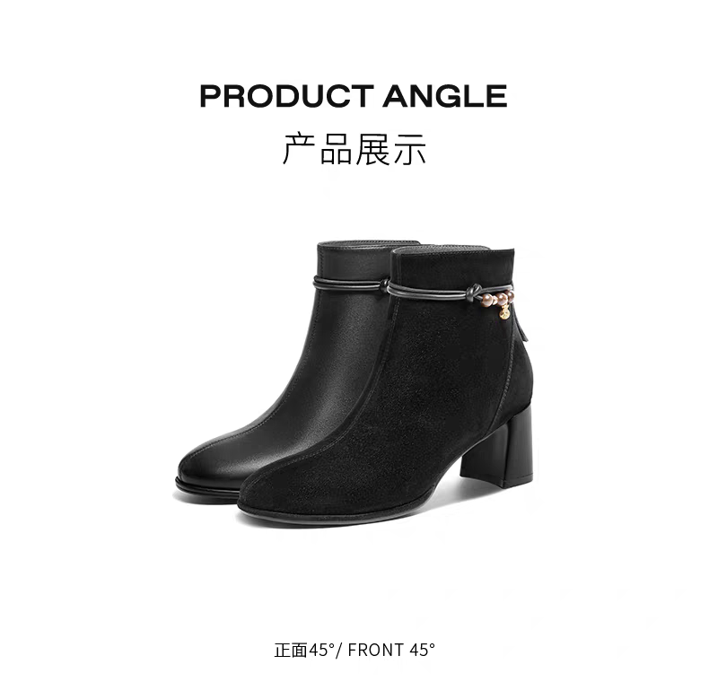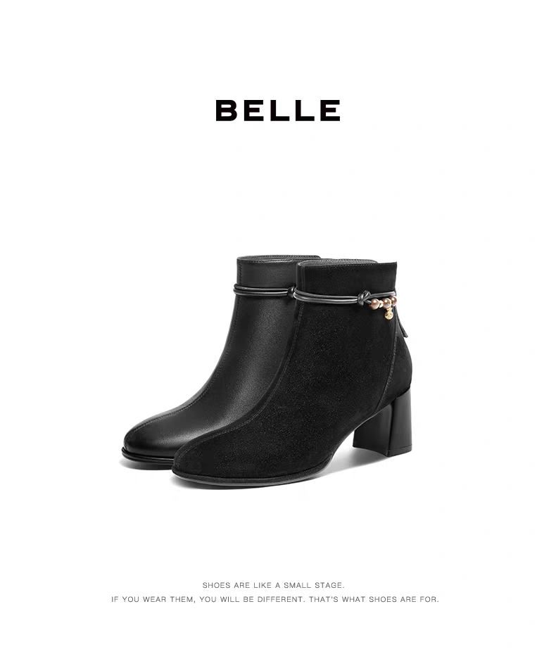 BF楼百丽显瘦超软羊皮时装靴子新款粗高跟气质加绒低筒短靴E8K1DDD5