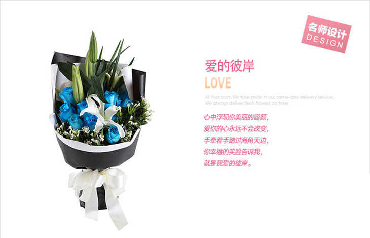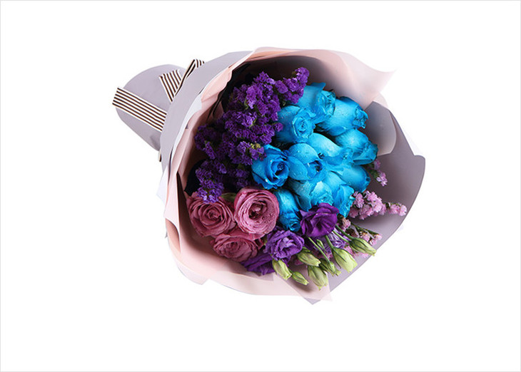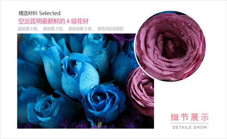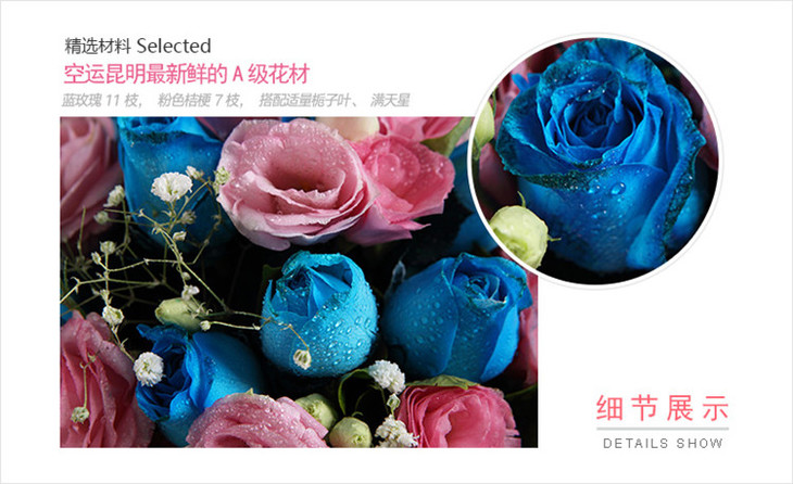 提前一天订购或订前咨询。蓝玫瑰为昆明产,人工染色而成。自然界不存在蓝色玫瑰,所有市面上的蓝玫瑰都是人工染色加工而成,敬请留意!