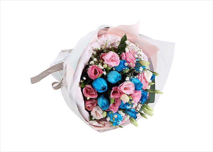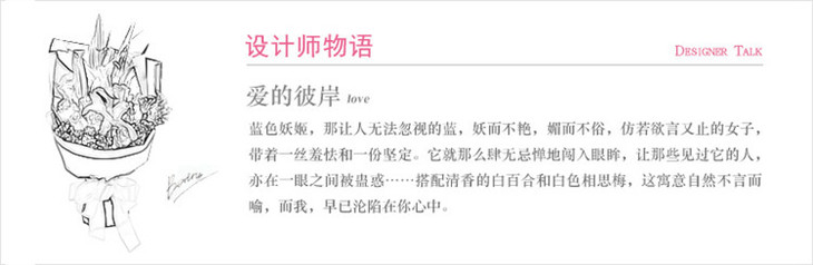 A款材 料:蓝玫瑰11枝,粉色桔梗7枝,搭配适量栀子叶、满天星