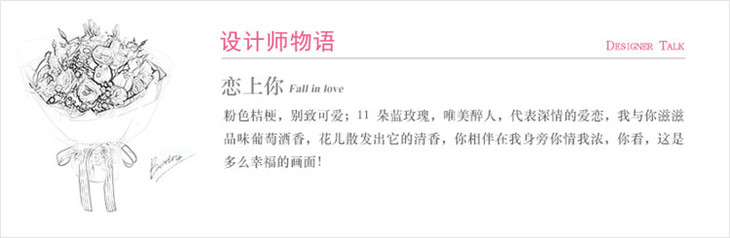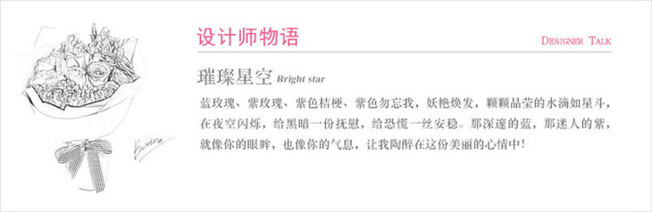 C款材 料:蓝玫瑰9枝,紫玫瑰3枝,紫色桔梗3枝,紫色勿忘我搭配