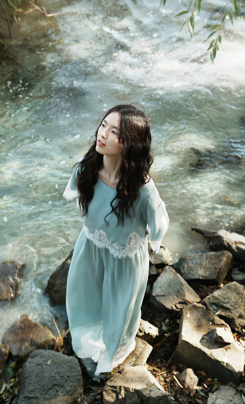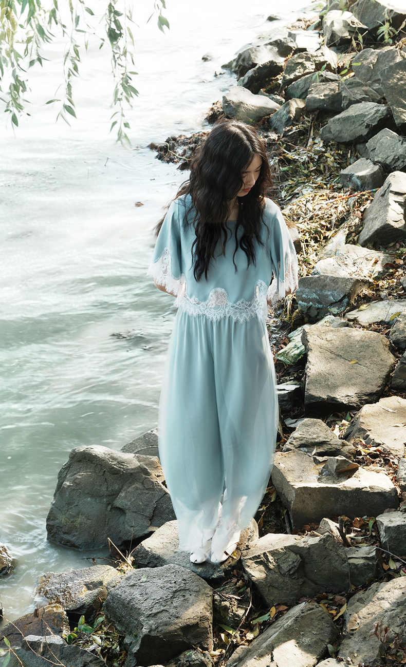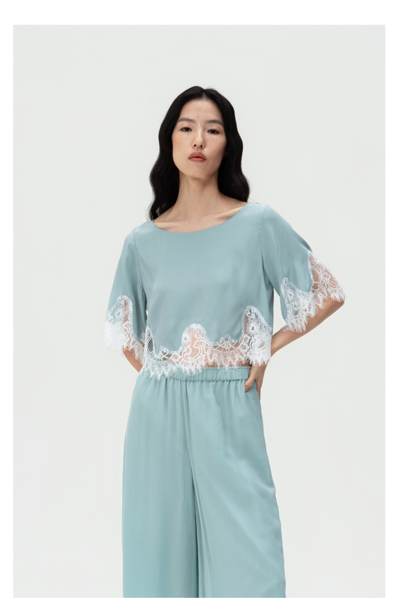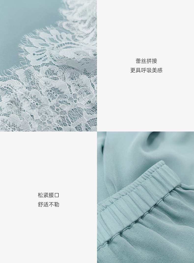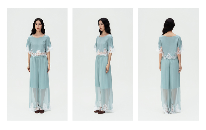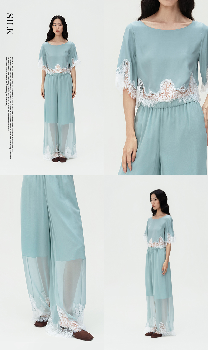 轻盈随心』桑罗蓝蕾丝拼接真丝睡衣套装100%桑蚕丝女家居服可外穿