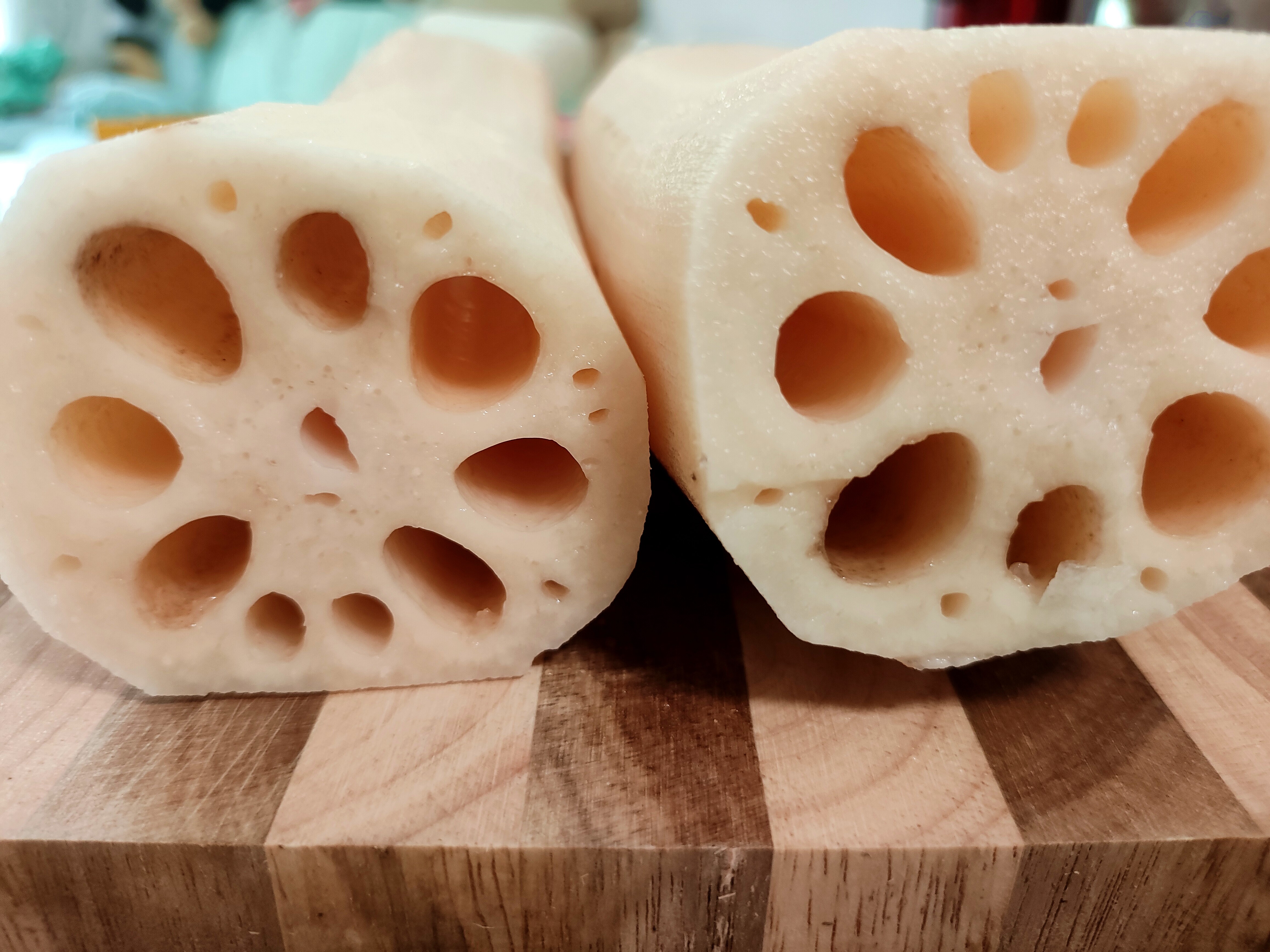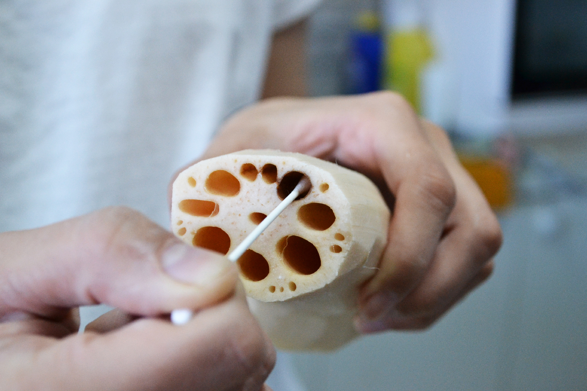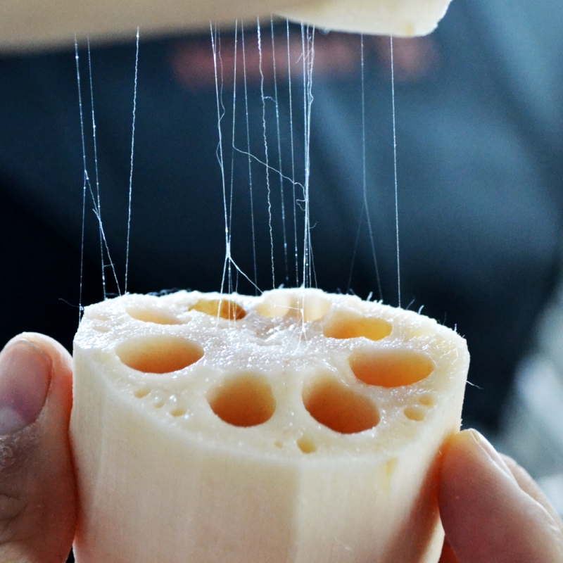 刨皮后,露出白玉般的色泽,藕肉洁白细嫩,细闻清新怡人,还能拉出很长的藕丝。