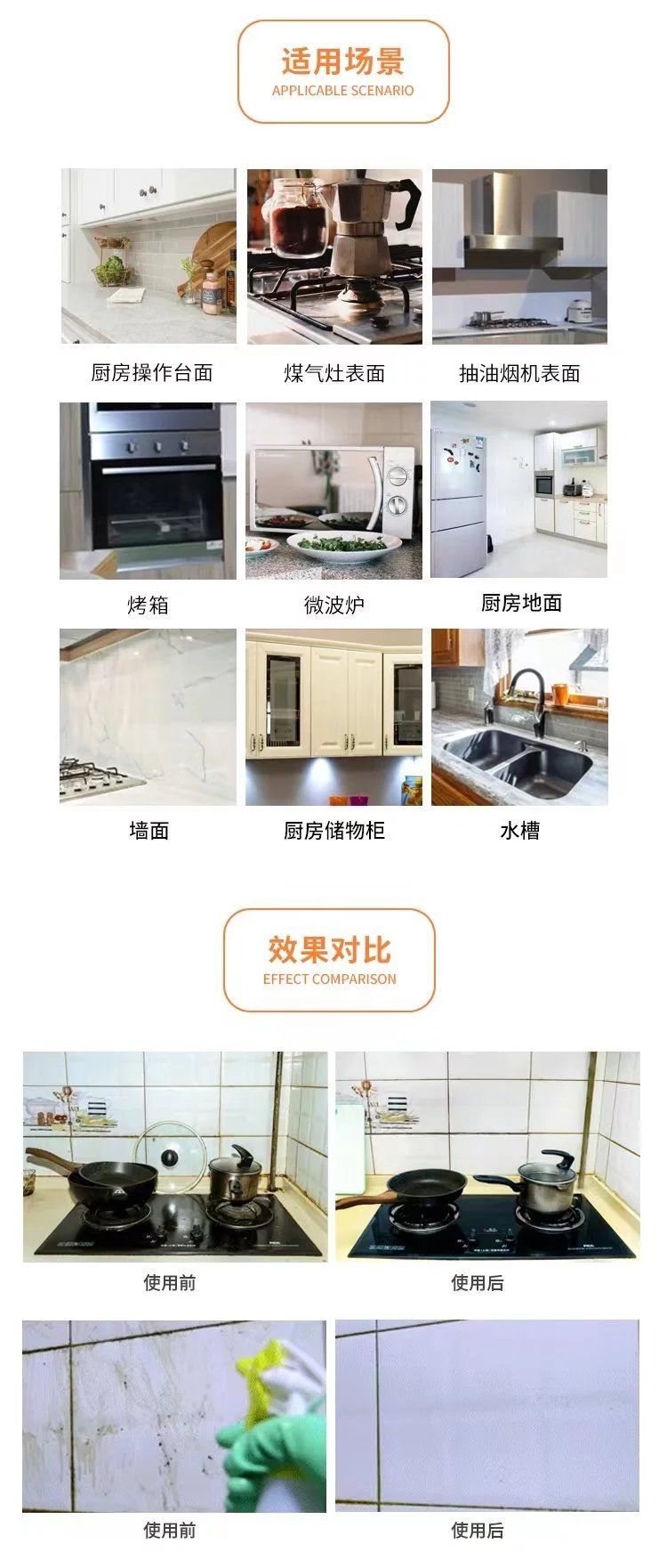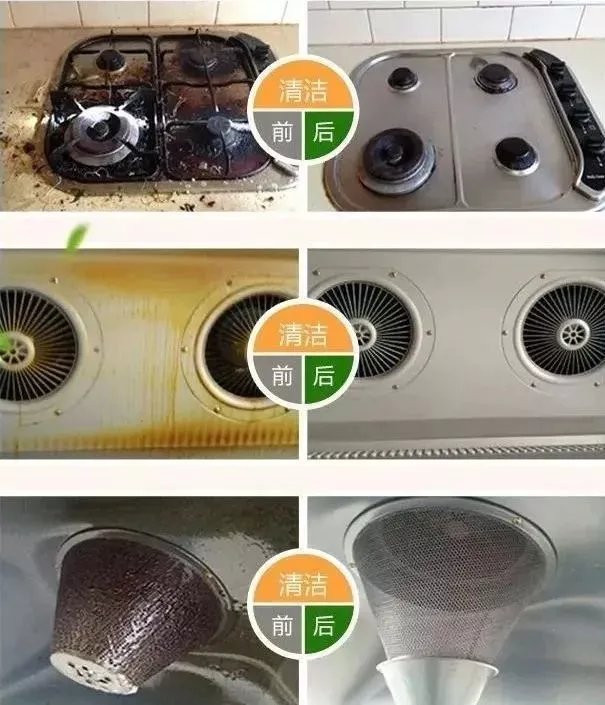 它适用于抽油烟机、煤气灶、操作台面、橱柜、水槽、墙面及厨房地面