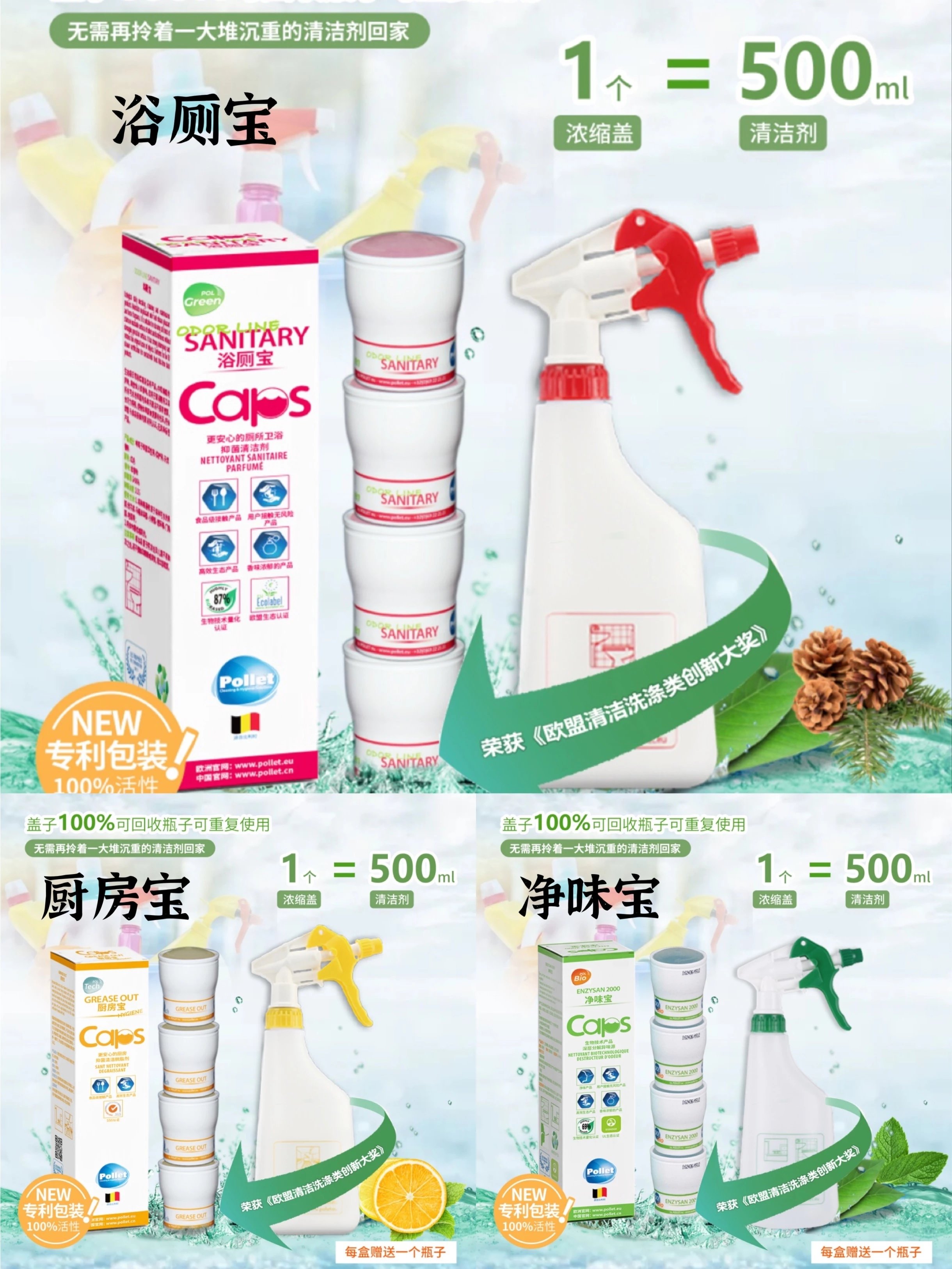 【品名】:比利时普莱特Pollet厨厕净味三宝浓缩清洁液