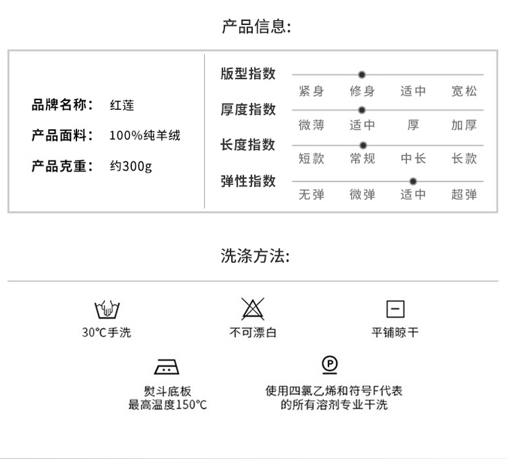 洗涤建议:建议干洗,或用中性洗涤剂低温手洗。