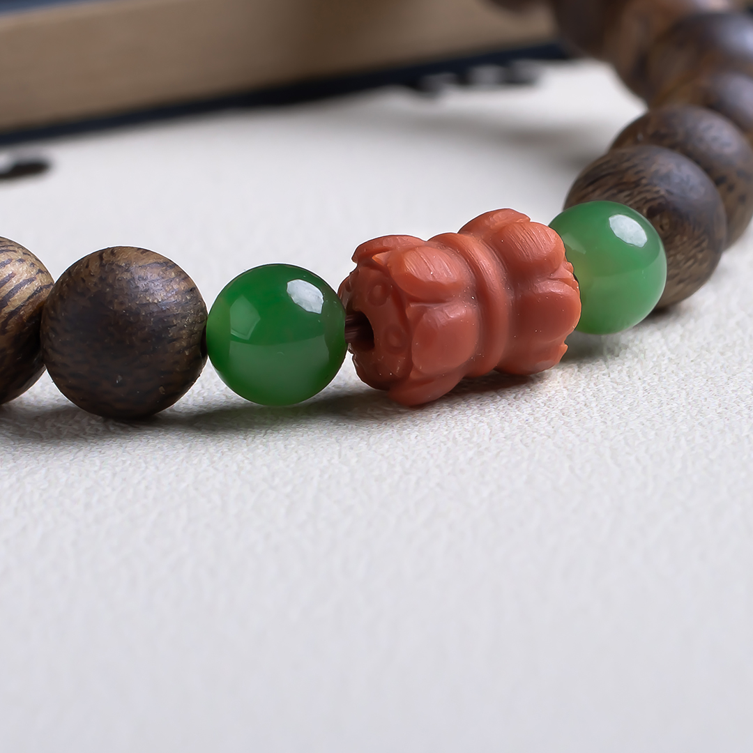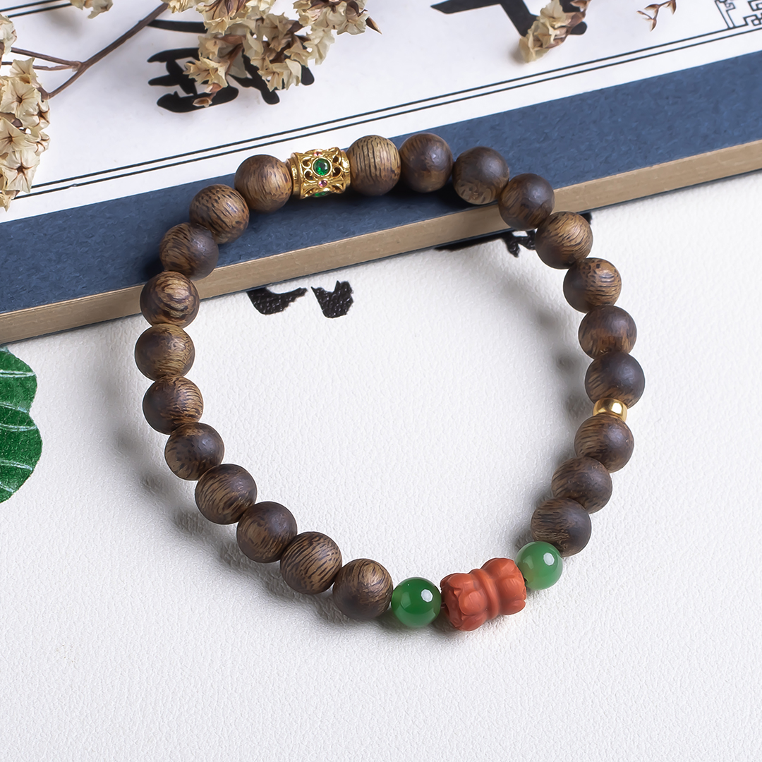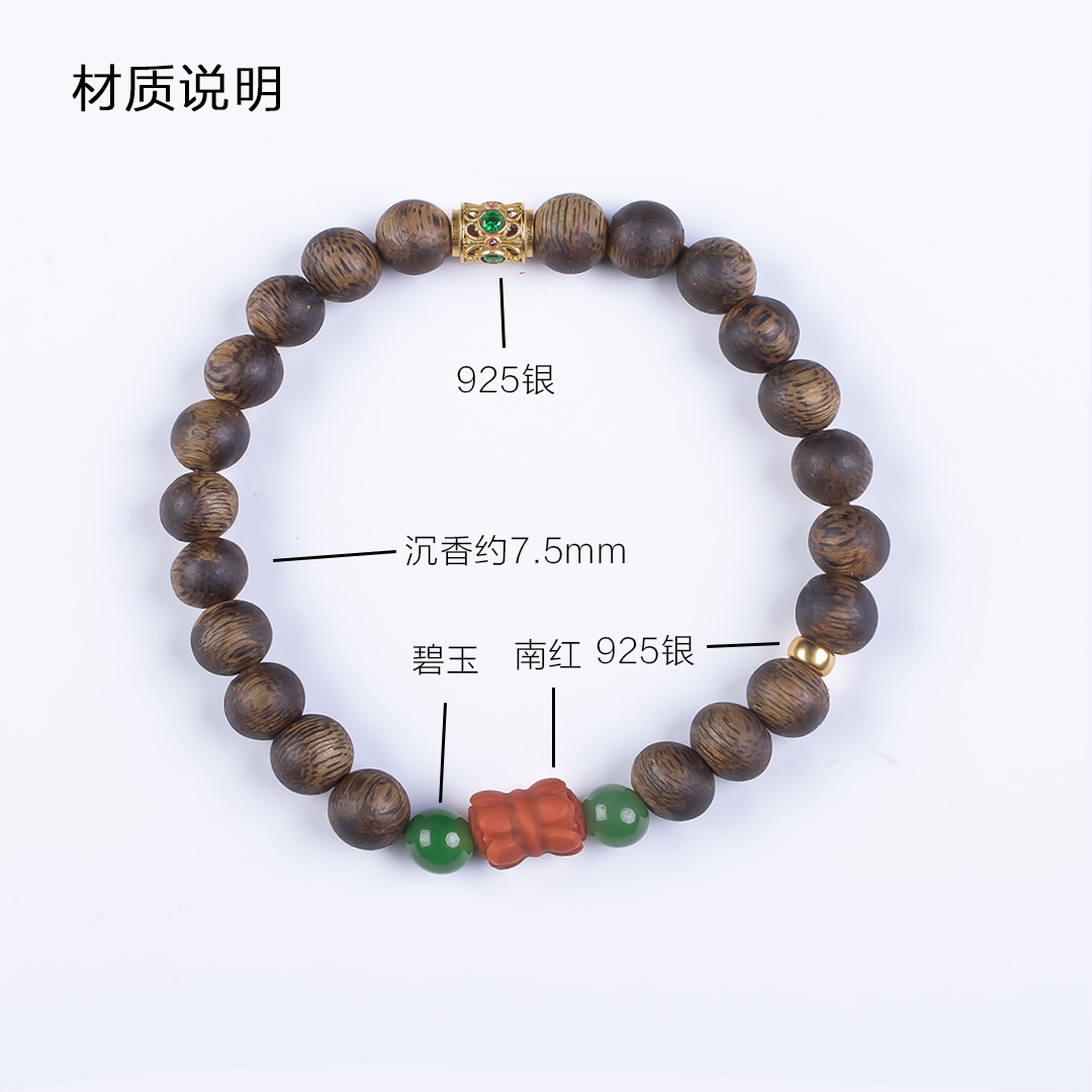 xy0513沉香+碧玉南红并蒂莲手串,天然沉香约7.5mm,原色原味,香味自然清甜,简约款式,南红碧玉经典搭配,温润典雅,吉祥纳福。