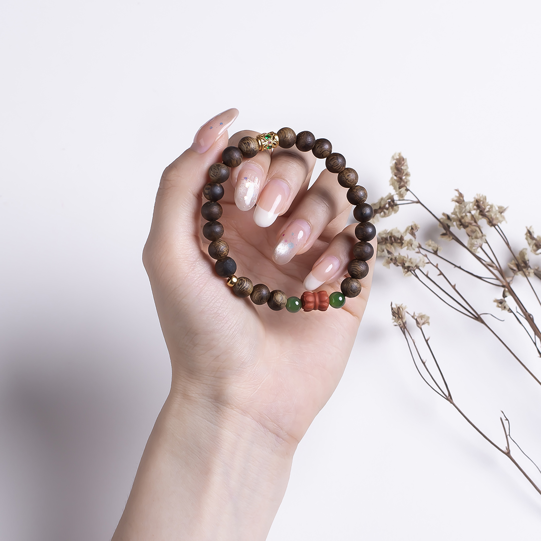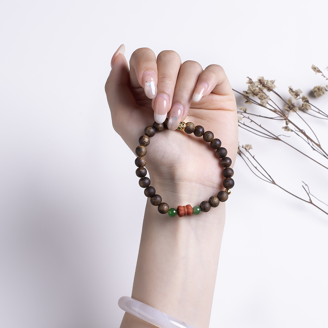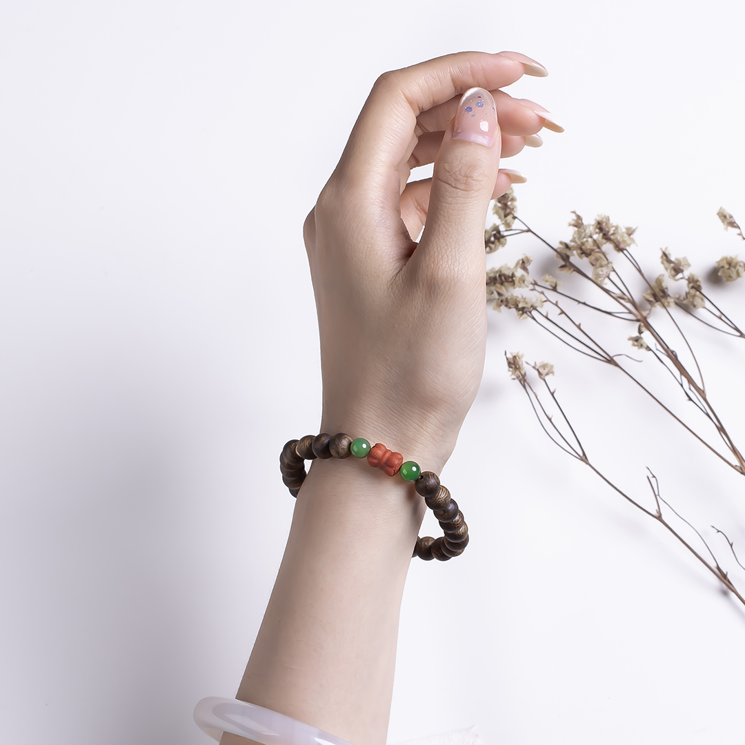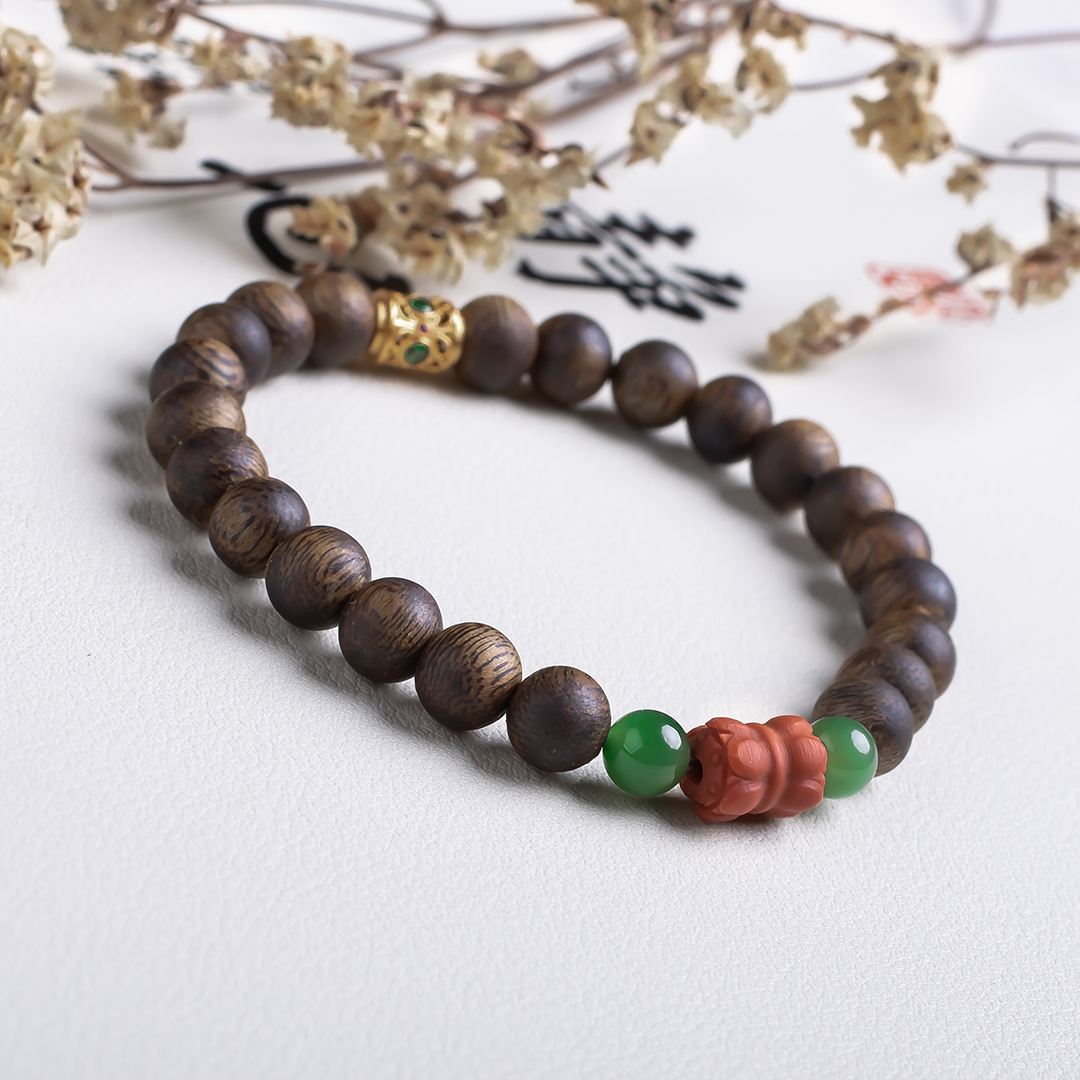 xy0513沉香+碧玉南红并蒂莲手串,天然沉香约7.5mm,原色原味,香味自然清甜,简约款式,南红碧玉经典搭配,温润典雅,吉祥纳福。