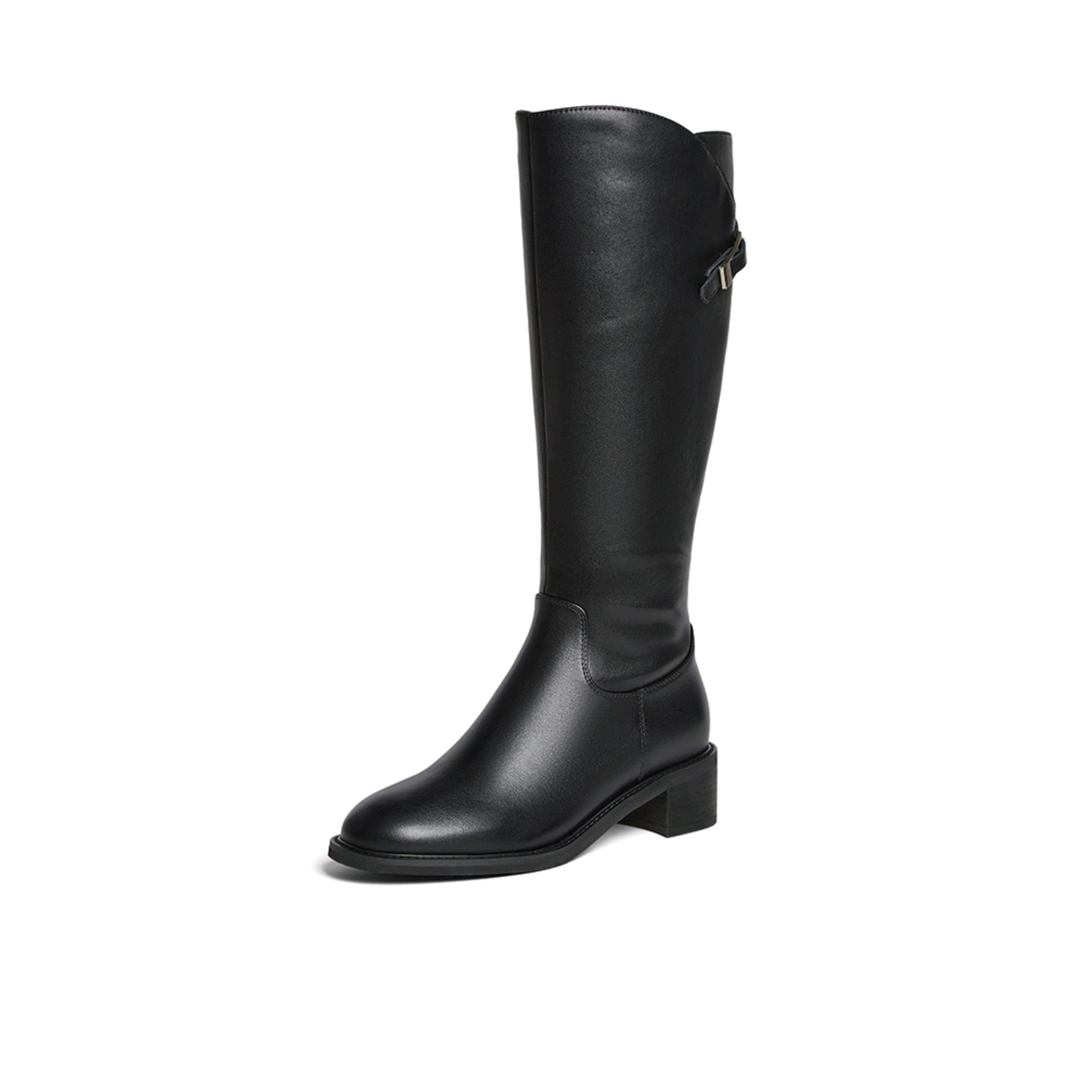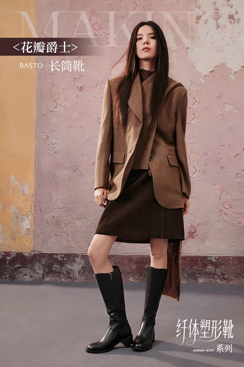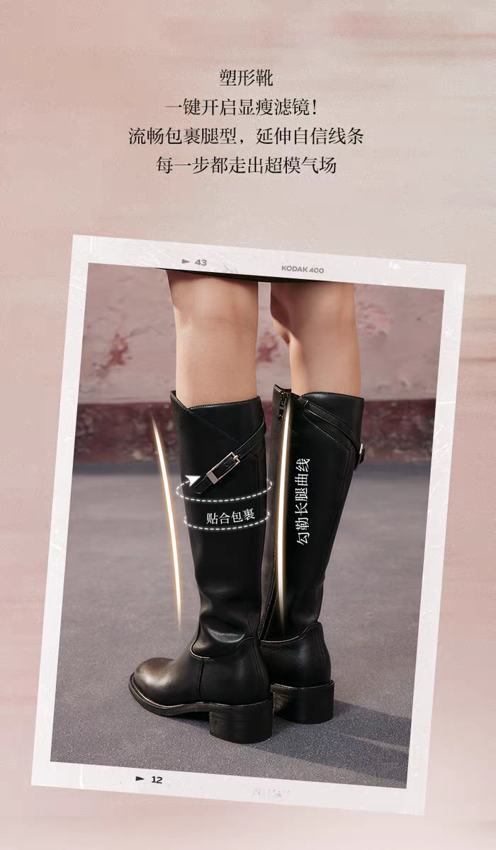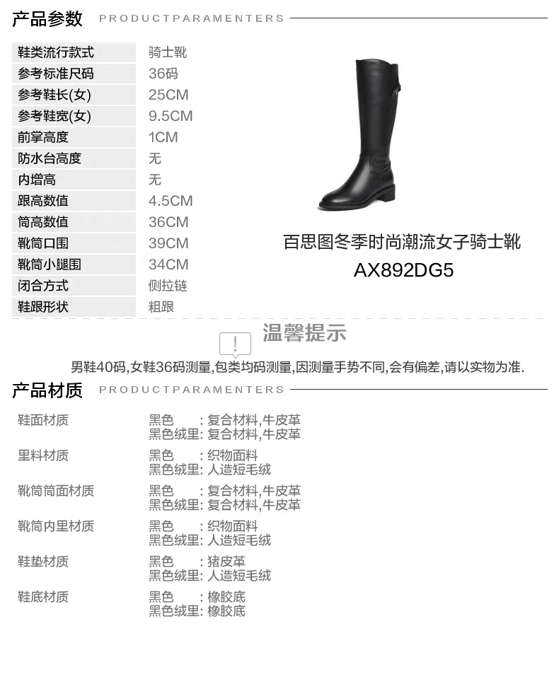 【云粉节】BF楼百思图25冬新款牛皮黑色骑士靴通勤粗跟女大筒围高筒长靴AX892DG5吊牌价1699.现价699