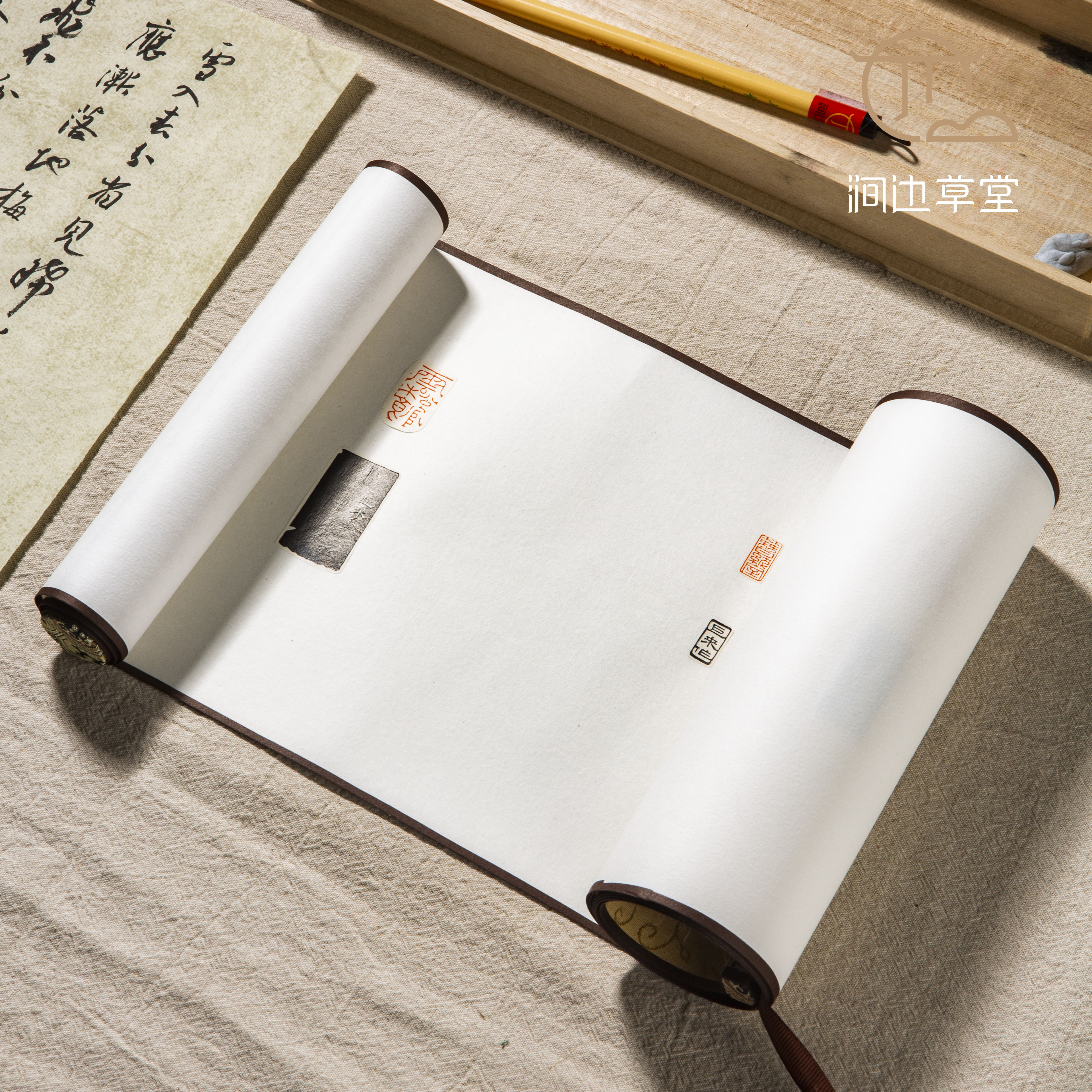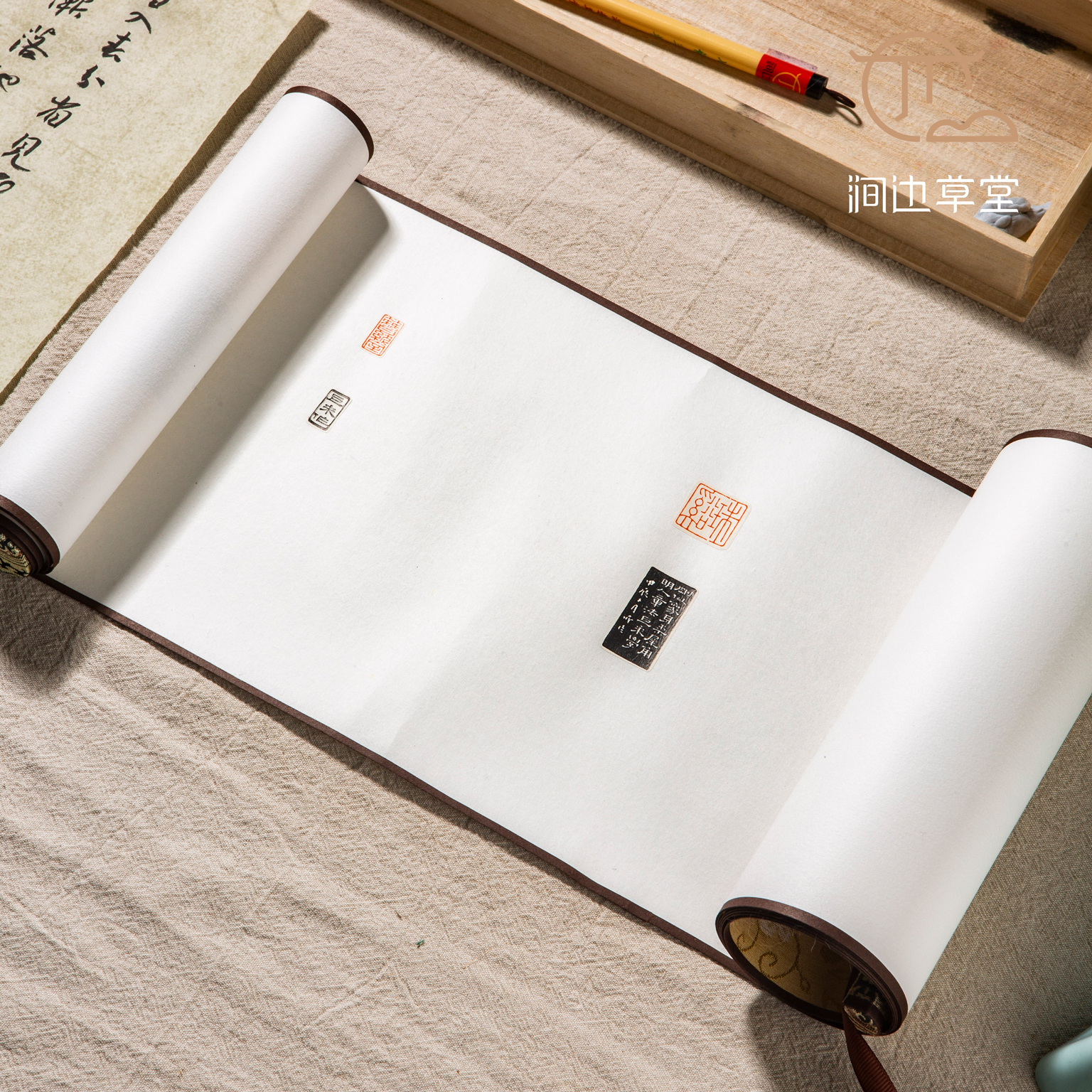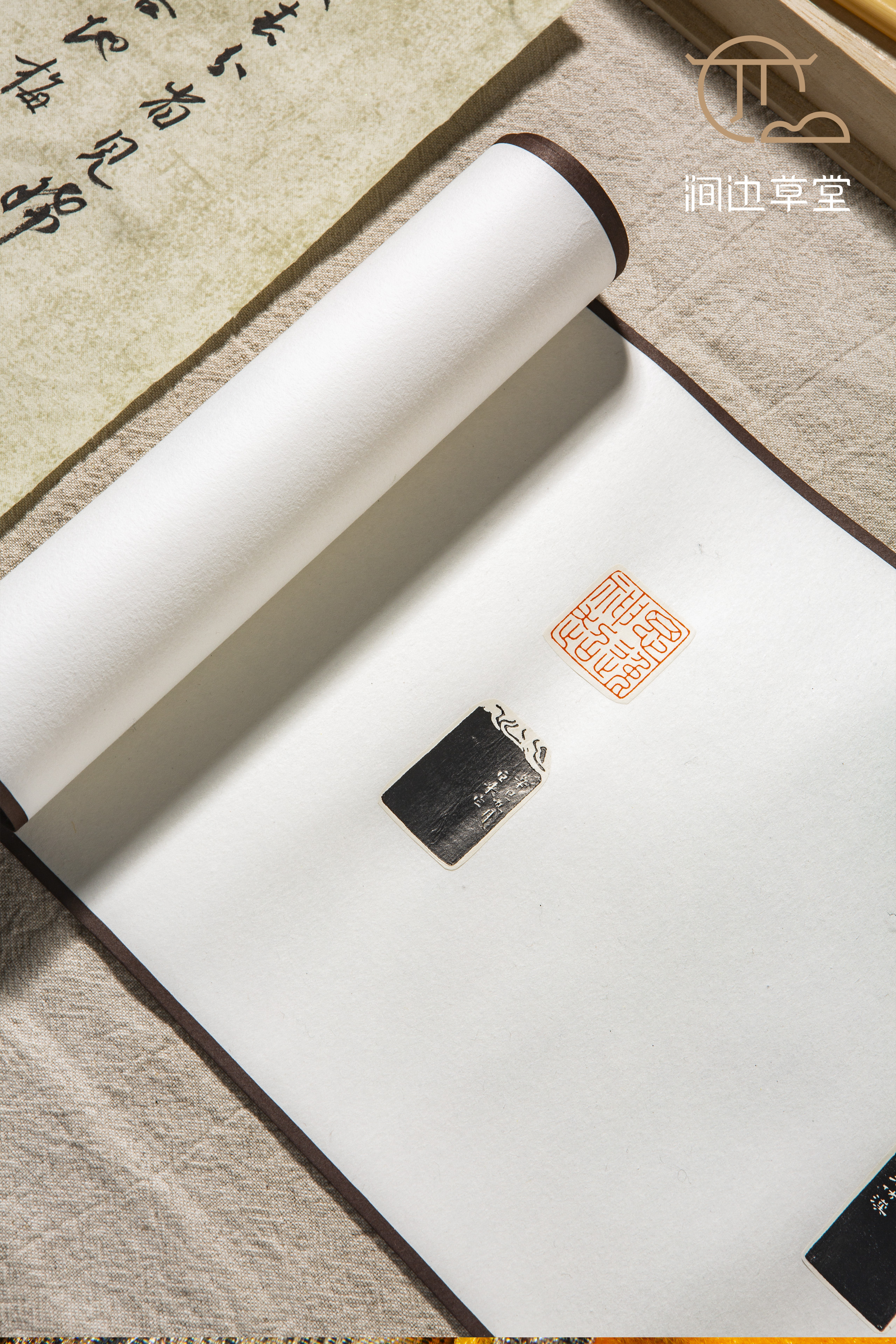 《陈巨来印蜕》手卷,每一方印章均为原石钤印,边款为乌金拓,手卷装裱精致。此手卷不仅是收藏和学习的佳品,还可供书法家进行题跋创作,用此手卷创作的题跋作品,必将是一幅精品。