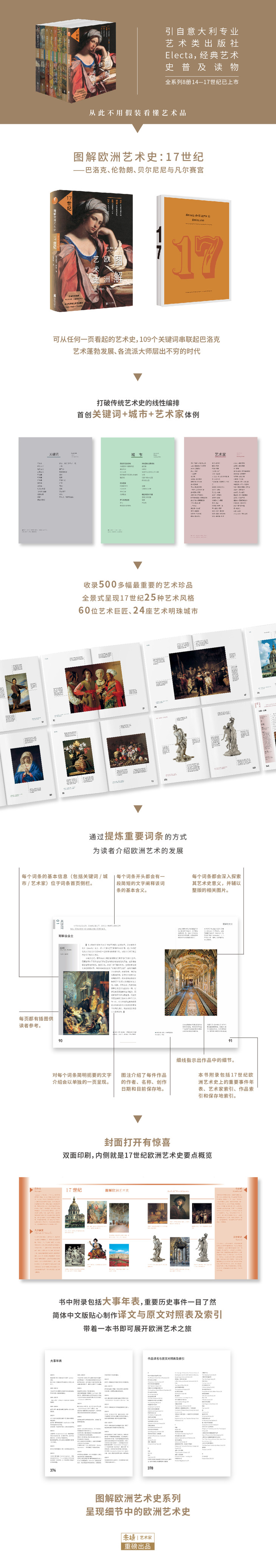本书为“图解欧洲艺术史”系列的第四本,该系列由意大利最大的出版集团Mondadori旗下专业出版艺术类图书的Electa出版社出版。这是一部欧洲艺术史普及图文书,以图解形式讲解了17世纪的社会文化背景、欧洲艺术的发展流变、以及60多位重要艺术家的生平及作品。17世纪的欧洲,巴洛克艺术蓬勃发展,相继涌现了许多对后世艺术发展产生深远影响的艺术家,如贝尔尼尼、卡拉瓦乔、伦勃朗、鲁本斯等。17世纪的巴洛克艺术风格,较之前的文艺复兴时期艺术已经有了较大差别,构图更加立体,对光线的描绘更自然等。17世纪可以说是一个艺术自由的年代。