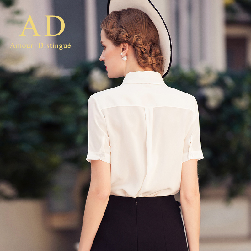 时尚春夏白色衬衫雪纺衫甜美娃娃领系带短袖衬衣套装高端职业装