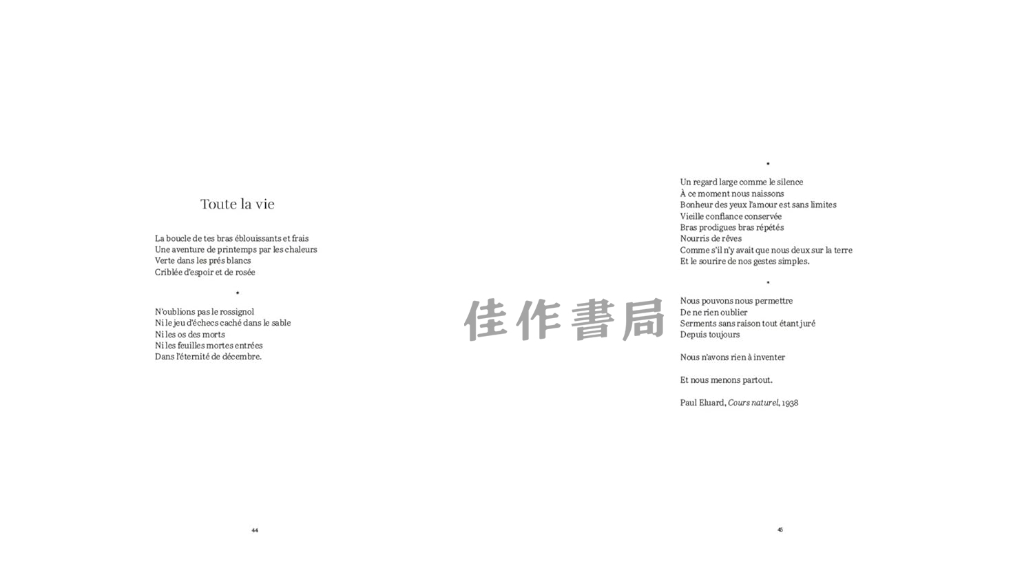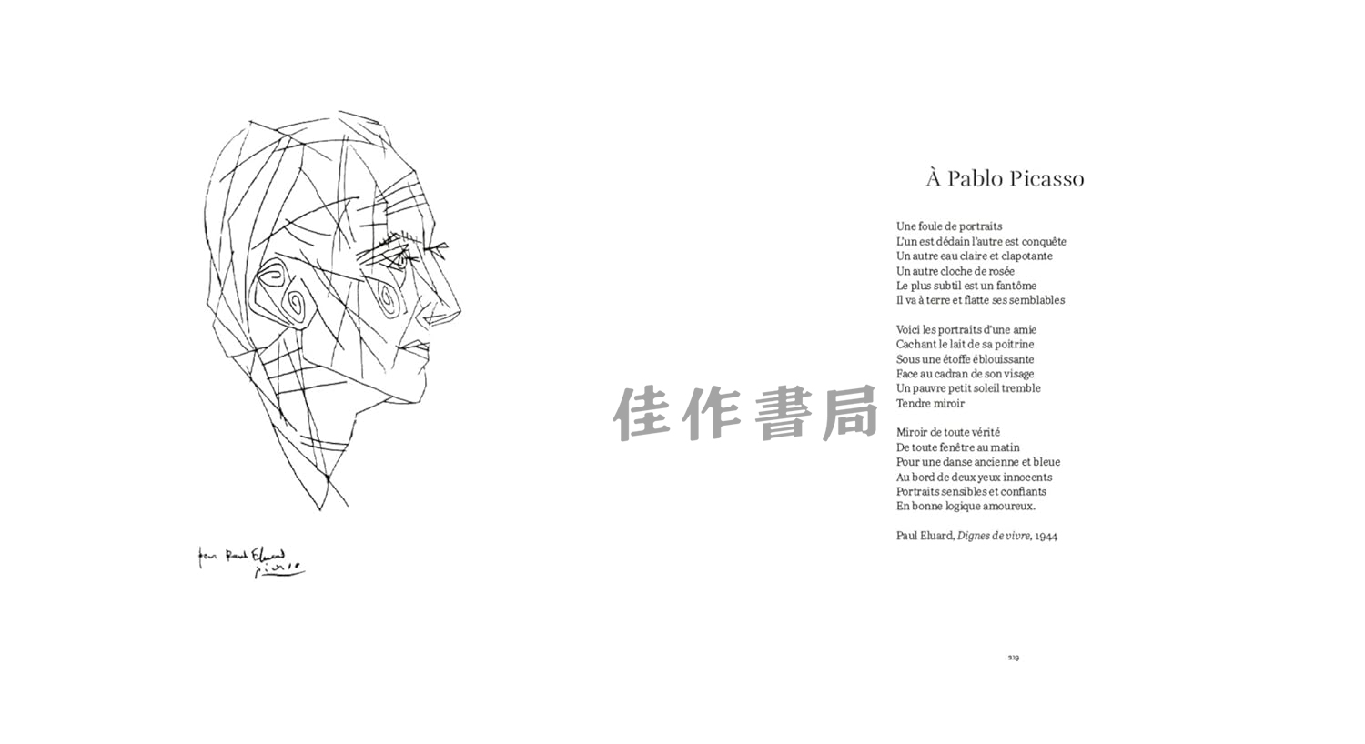 保罗·艾吕雅与巴勃罗·毕加索的友谊诞生于20世纪20年代中期,正值超现实主义运动蓬勃发展之际。1935年,这份友谊开启了新的篇章,在随后的17年里,他们的交流毫无阴霾,直至1952年艾吕雅去世。西班牙内战和格尔尼卡的悲剧,巩固了他们反对纳粹主义和法西斯主义、支持各国人民自由与和平的共同承诺。这一承诺在1951年的《和平的面容》中得到了最终体现,这是他们合作的唯一作品。毕加索以鸽子为主题创作的各种变体画——鸽子由此获得了其作为象征的普遍地位——与艾吕雅的短诗在作品中相互呼应。艾吕雅的短诗温柔质朴,让人回想起1914 - 1918年战争结束时,他的和平主义所激发创作的《和平诗篇》。艾吕雅不同时期的诗歌丰富了这本选集,彰显了两位20世纪最重要艺术家对和平的承诺。