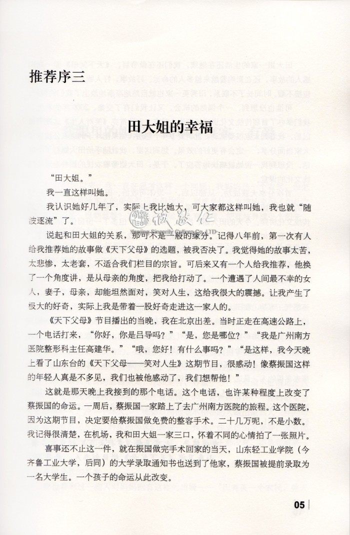 当时我想,这是上天对强者的青睐。只有不服输的人,只有敢于向坎坷命运挑 战的人,才能看到胜利的曙光! 在我的细心引导和鼓励下,振国一直保持着一个好的心态。他知道自己的样子特殊,但是从来不认为自己长得丑,他很喜欢唱歌,不怕和人打交道,有很多衣服都是振国自己上街给人家讨价还价买来的。 他还有一面非常漂亮的小镜子,像每一个爱美的小伙子一样,自己会经常拿出来照照。 …… |