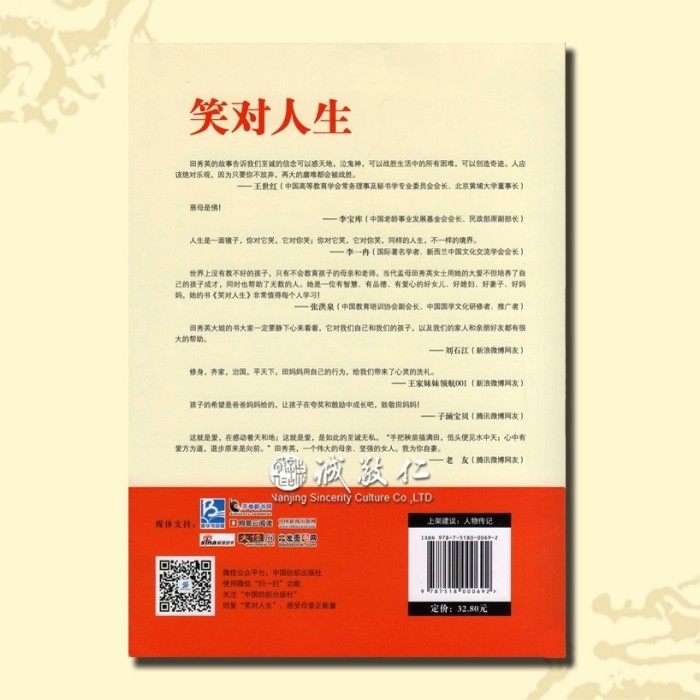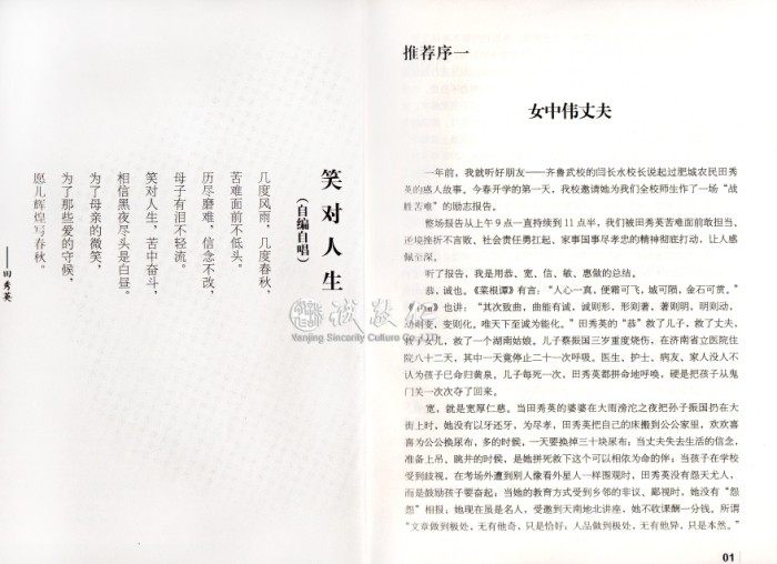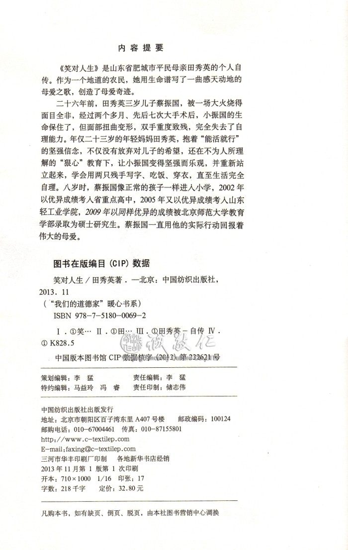 | 【基本信息】 书名:笑对人生:当代孟母田秀英大爱奇迹 2016版 作者:田秀英 著 出版社:中国纺织出版社 出版日期:2013-11-1(2016年2月重印) ISBN:9787518000692 字数:218000 页码:252 版次:2016年2月第8次印刷 装帧:平装 开本:16开 原价:32.80元 本书为2016年2月重印最新版本。 【书籍目录】 第一章 上好苦难课 1 生死劫 3 爹不喜欢娘偏爱 5 苦命的爹娘 9 因为穷,所以要出人头地 13 攒钱给爹走亲戚 18 十八岁的爱情 21 第二章 只要活着比什么都好 25 天塌大祸:儿子烧成火球 27 儿啊,妈永远不会舍你 35 苦中作乐,笑对人生 38 钱再好,不是自己的也不能要 44 我爹给我留下的遗憾 47 用不花钱的笑脸伺候公爹 49 第三章 我儿当自强 53 人生字典里没有“残”字 55 吃苦吃出的幸福 57 谁也别想挡住我孩子上学的路 60 有让人瞧不起的人,没有让人瞧不起的脸 63 我们家的游戏课 67 疼我挂我的母亲走了 72 次学洗衣服 77 一波三折上高中 80 第四章 看见命运在转向 87 苦日子是不是到头了 89 儿子终于“抬”起了头 92 俺振国考上大学了 96 振国提前被大学录取 100 爱的接力:实现十七年的整容梦 104 饱含血泪的大学录取通知书 112 第五章 为了温暖更多人的心 115 被全国人民打成的“田妈妈热线” 117 女儿也是苦命人 1387 回报社会,多救一个是一个 143 千里之外,用我的爱抚平他者的伤痛 159 荣获全国道德模范提名奖 163 第六章 人生不设限 167 儿子跨专业考研 169 成为奥运火炬手 173 受邀观看残奥会开幕式 177 冯家杭村个研究生出炉记 179 愿儿激励更多人 182 第七章 做父母的智慧 185 爱的十种工具 187 不要做“瞎子父母” 190 不要在孩子的内心种下仇恨的种子 192 做让孩子瞧得起的父母 195 当孩子给你讲条件的时候 199 杜绝孩子图小便宜的心理 202 孩子可以不说谎 204 内向的孩子多关注 206 孩子有缺点,当众说不得 209 用亲情抚慰孩子生病的心 213 找回失落的亲子关系 217 别让孩子中了语言的毒 221 家庭伦理丢不得 224 第八章 孩子,你可以活得很精彩 227 别让相貌毁了你的一生 229 大学生怎么面对失恋 232 选择仇恨,不如选择放手 234 女人做娇妻,男人做爱人 236 坦然面对味人生 238 后 记 女人再强也不要失去做女人的温柔 241 附录一 振国眼里的妈妈:何为笑对人生 246 附录二 田秀英母子活动一览表 249 附录三 从田秀英教子想到如何做个好母亲 249 附录四 田妈妈语录251 【作者介绍】 田秀英,女,49岁,山东肥城人 一个吃尽苦头的农村妇女, 一个笑对人生的坚强女性, 一个遭遇人间不幸的女人, 一个抱着“能活就好”不离不弃的妈妈, 一个把重残儿培养成才、用爱把残缺变完美的母亲 一个热心助人、献身公益的传统文化讲师, 一个孝敬公婆、善待老人的“孝老爱亲模范”, 一个无论到哪都受人尊敬的“田妈妈”, 一个曾受胡锦涛接见、先后受聘为数十所中学、大学和社会组织的德育老师和客座教授,一个获得最多鲜花、掌声和荣誉的“优秀母亲”、“感动人物”、“奥运火炬手”、“全国道德模范”,因为她,“母亲”两个字更加温馨动人,她也用自己二十多年的亲身经历,验证了“有一个好母亲就有一个幸福美满的家庭”的事实。 【内容提要】 《笑对人生》是山东肥城市平民母亲田秀英的人生自传。作为一个地道的农民,她用生命谱写了一曲感天动地的母爱之歌,创造了母爱奇迹。 《笑对人生》讲述的是26年前,田秀英3岁儿子蔡振国,被一场大火烧得面目全,经过两个多月、先后7次大手术后,小振国的生命保住了,但面部扭曲变形,双手重度致残,完全失去了自理能力。 年仅23岁的年轻妈妈田秀英,抱着“能活就行”的坚强信念,不仅没有放弃对儿子的希望,还在不为人所理解的“狠心”教育下,让小振国变得坚强而乐观,并重新站立起来,用两只残手写字、吃饭、穿衣,直至生活完全自理。8岁时,蔡振国像正常的孩子一样进入小学,2002年以优异成绩考入省重点高中,2005年又以优异成绩考入山东轻工业学院。2009年蔡振国以同样优异的成绩被北京师范大学教育学部录取为硕士研究生。 田秀英母子演绎的是中华文化的天地之道,并给中华民族母慈子孝的美德文化长卷添了炫丽的一笔。一句“苦难不是财富,战胜苦难才是财富”、“谁说残儿不成才”,超越苦难和挫折,感染他人,升华自己的灵魂,也同时提升了所有为之感动为之前行的人们的精神境界。 【编辑推荐】 ※笑对人生的好妈妈,传递母爱最美正能量。用自己验证着“母爱能战胜一切苦难,母爱的伟大能把残缺变成完美”! ※ 她说,“母爱是不能打折的”“哭也是活着,笑也是活着,咱为什么不笑着过日子?“让孩子成为有用之人,而不是一个要饭吃的残疾人。” ※她说,在她的脑子里只有希望和梦想,没有苦难;她告诉我们,无论什么时候击,无论受什么打击,都要抱着希望活下去。 ※她想对全天下的母亲说:“未来的竞争,不是国与国之间的竞争,而是娘与娘之间的竞争。”她告诉天下的父母,要想孩子优秀,必须当父母的先优秀! ※正向的母爱缔造生命的奇迹。该书未上市便遭疯狂订购,已有数的预订量,田妈妈育重残儿成才,救无数家庭,曲折和丰富程度超越《绝望锻炼了我》,成口碑良品。 ※她的事迹感动大半个中国,新浪和腾讯微博网友自动发表感想及评论、转发讲座视频高达3000条,上家媒体连年报道,十几家著名影视公争相拍摄田妈妈的故事。 ※献身公