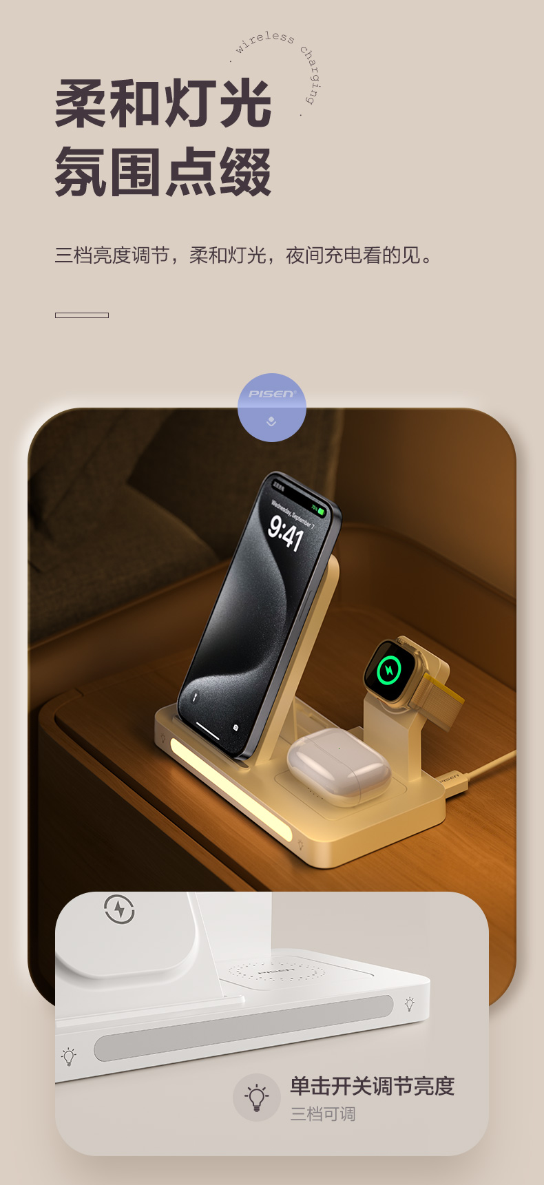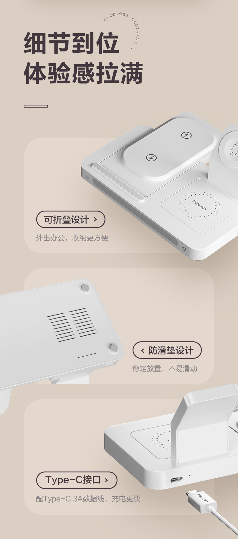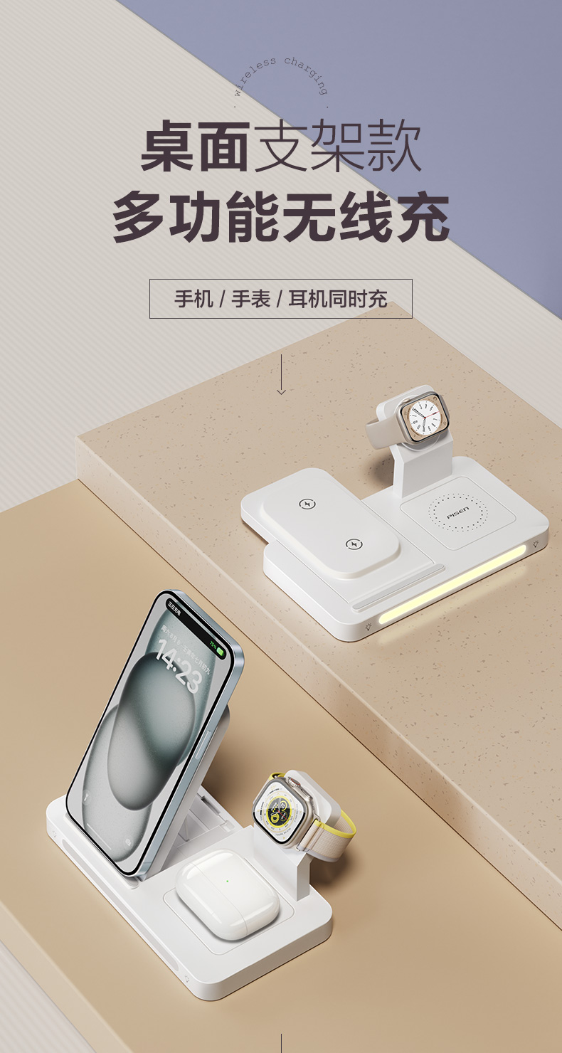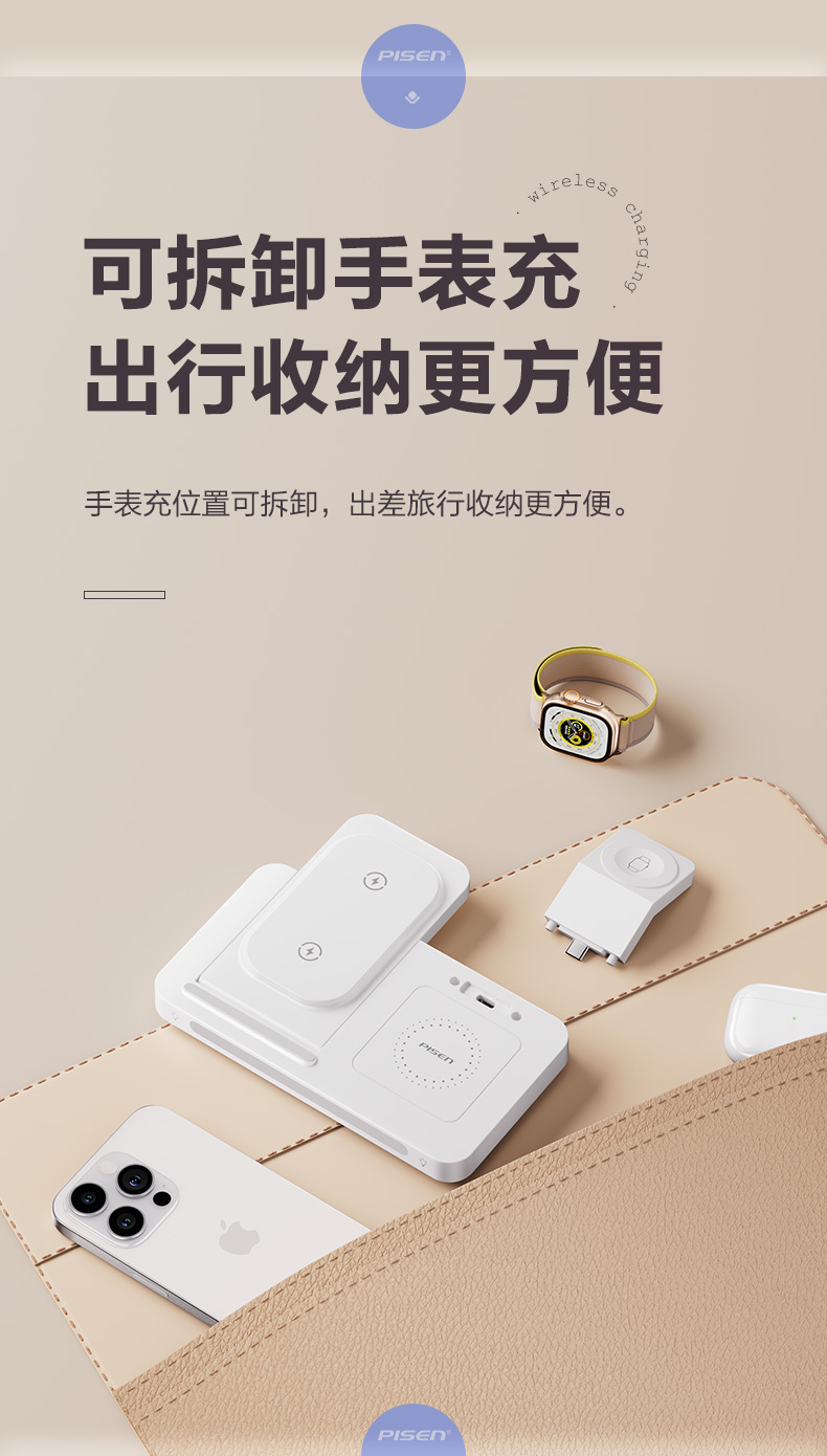 品胜 多功能三合一折叠无线充电器(夜灯版) 无线底座适用于苹果14手机苹果手表充电苹果蓝牙耳机无线充电