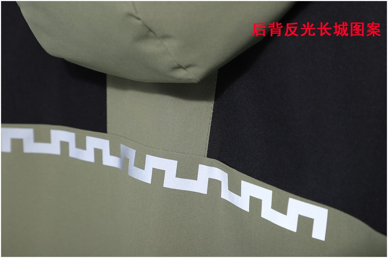胸口硅胶反光标+后背硅胶长城图案,内里透气隔汗网布,防水防污防风,可拆卸帽,衣物外标为胶印烫,请不要高温清洗,也不可甩干熨烫烘干