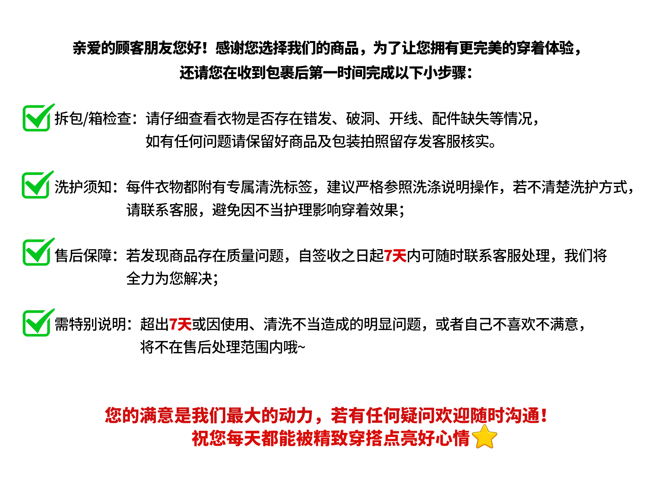 退换凭证:收货后记得不要着急剪掉退换凭证,先检查衣服有无瑕疵,如有问题及时联系客服退换货,一旦剪掉退换凭证就不支持退换货哦